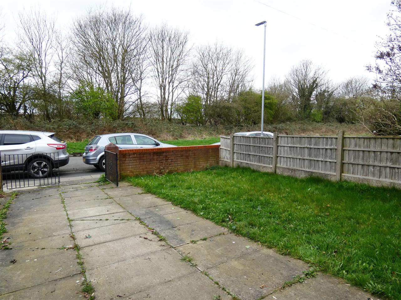 Enclosed garden, laid to lawn with adjacent paved driveway.