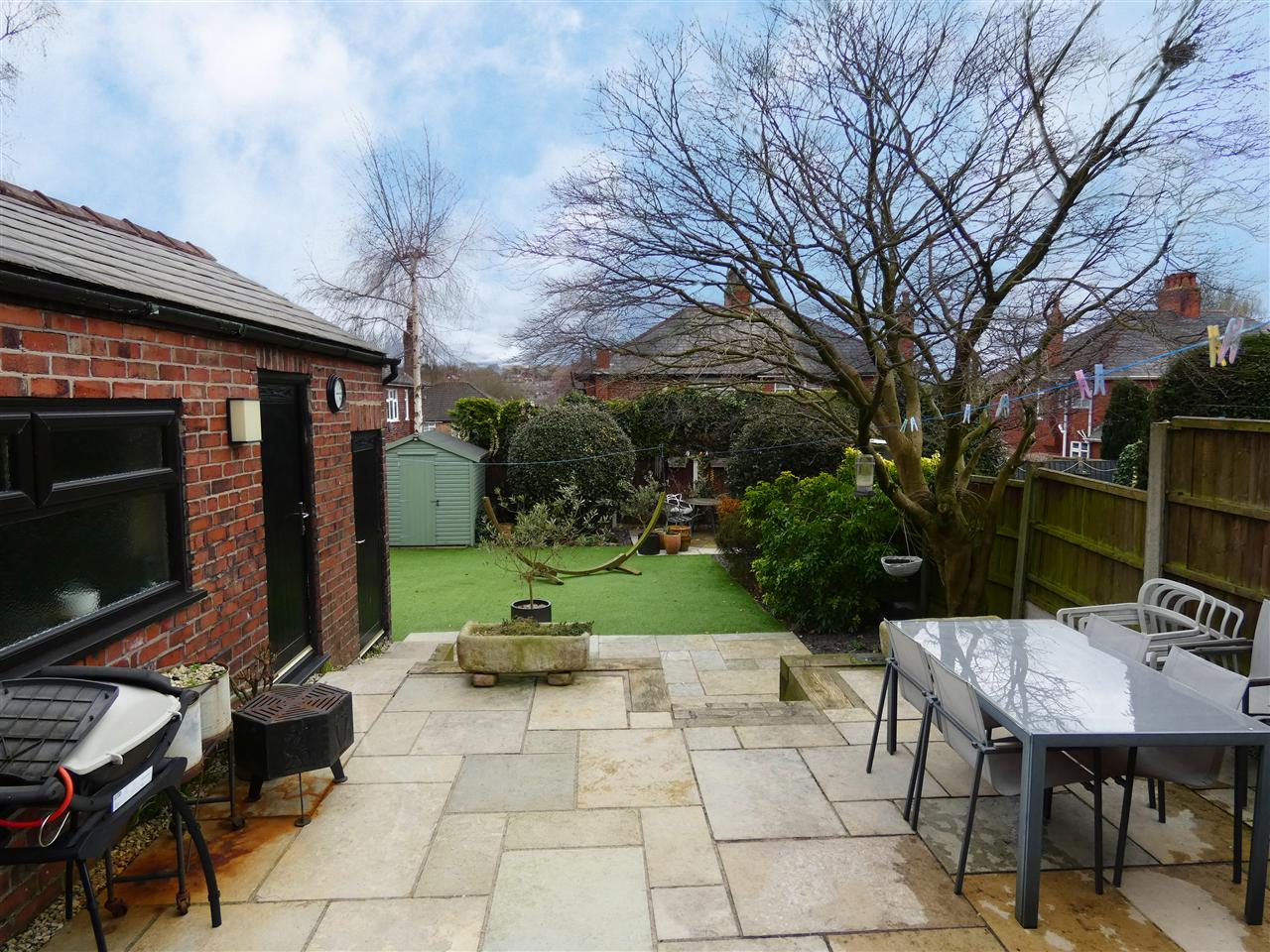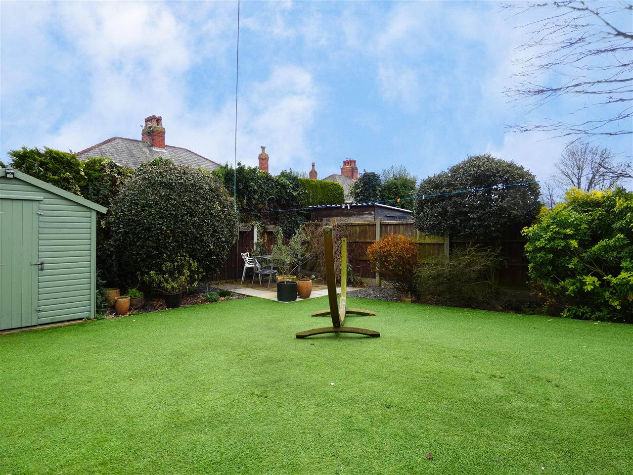 Enclosed garden with paved patio areas, artificial lawn with shrub borders, detached brick garage and store, timber shed.