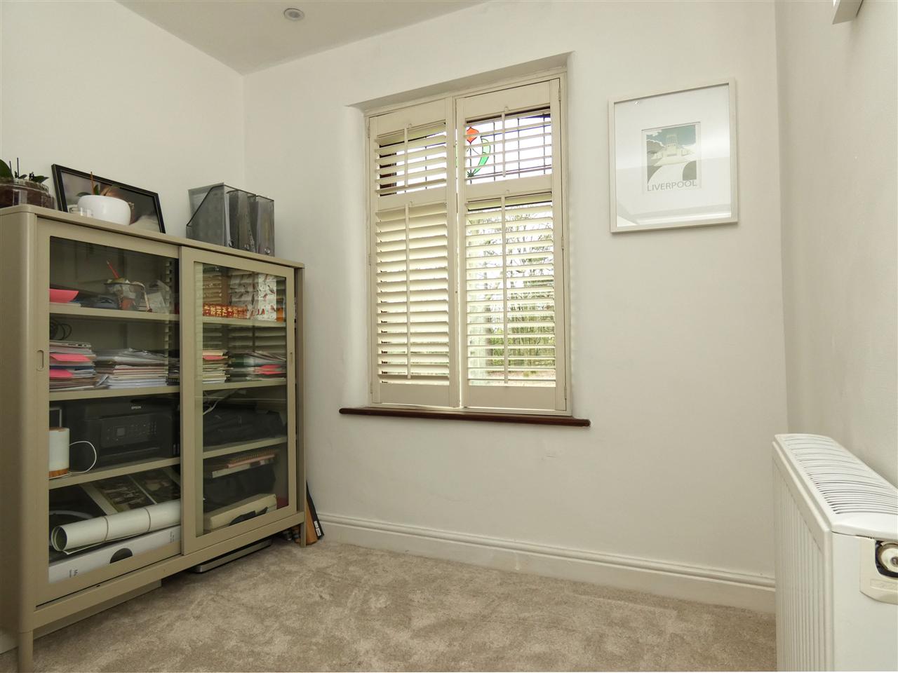 with cast iron fireplace, stripped floor boards, bay window to the front elevation with plantation shutters.
