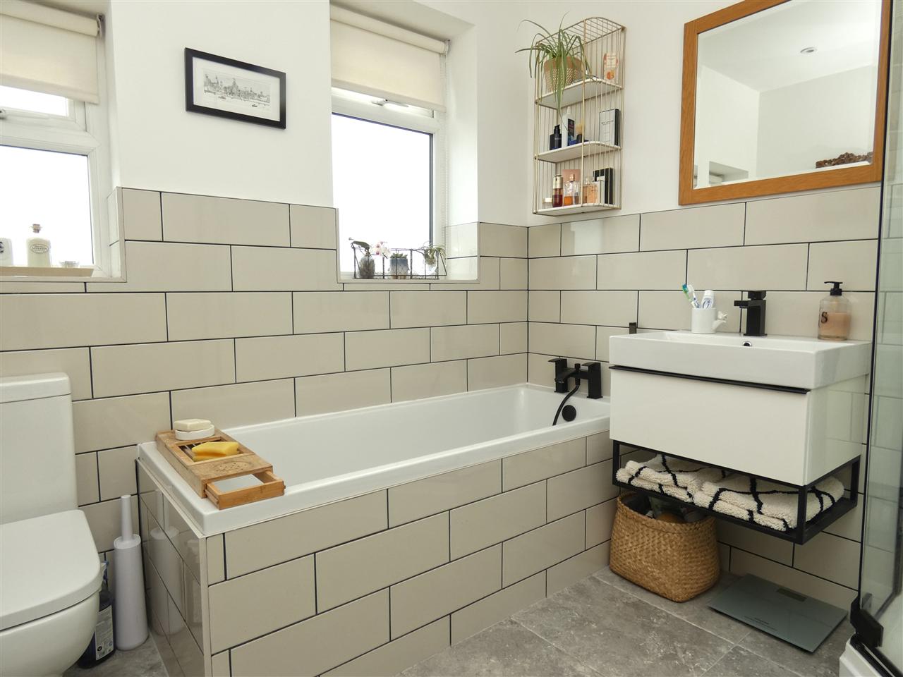 comprising of a modern four piece suite with black fixtures including shower cubicle with rainwater fitment, tiled bath with mixer taps and shower attachment, wall hung vanity wash hand basin, low level WC, heated towel radiator, part tiled walls, tiled floor, spot lighting, two windows to the rear elevation.