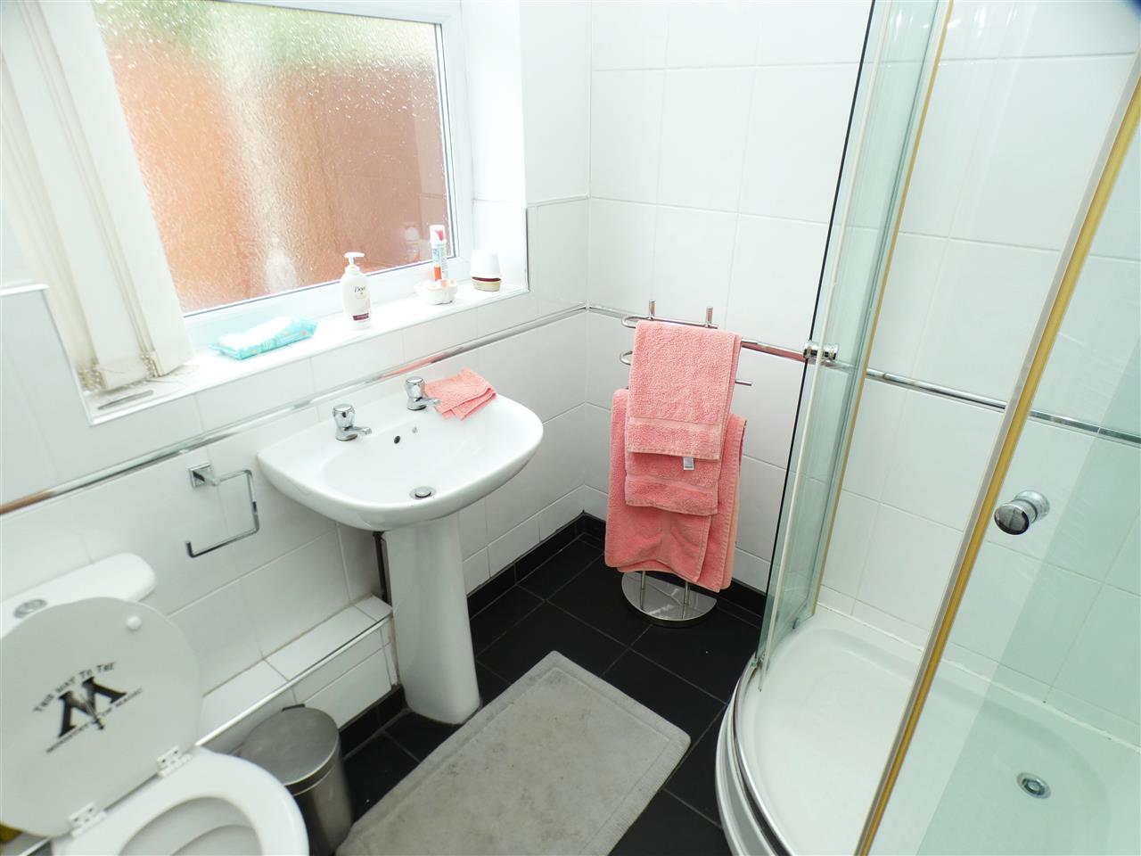 comprising of a panelled bath with Triton shower fitment over and glazed screen, pedestal wash hand basin, low level WC, tiled walls, window to the rear elevation.