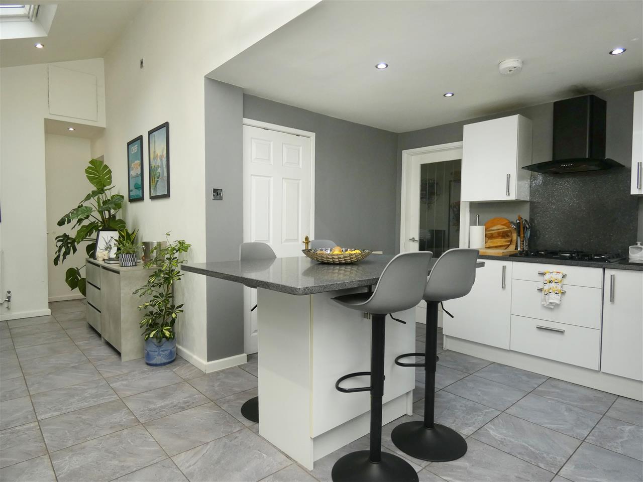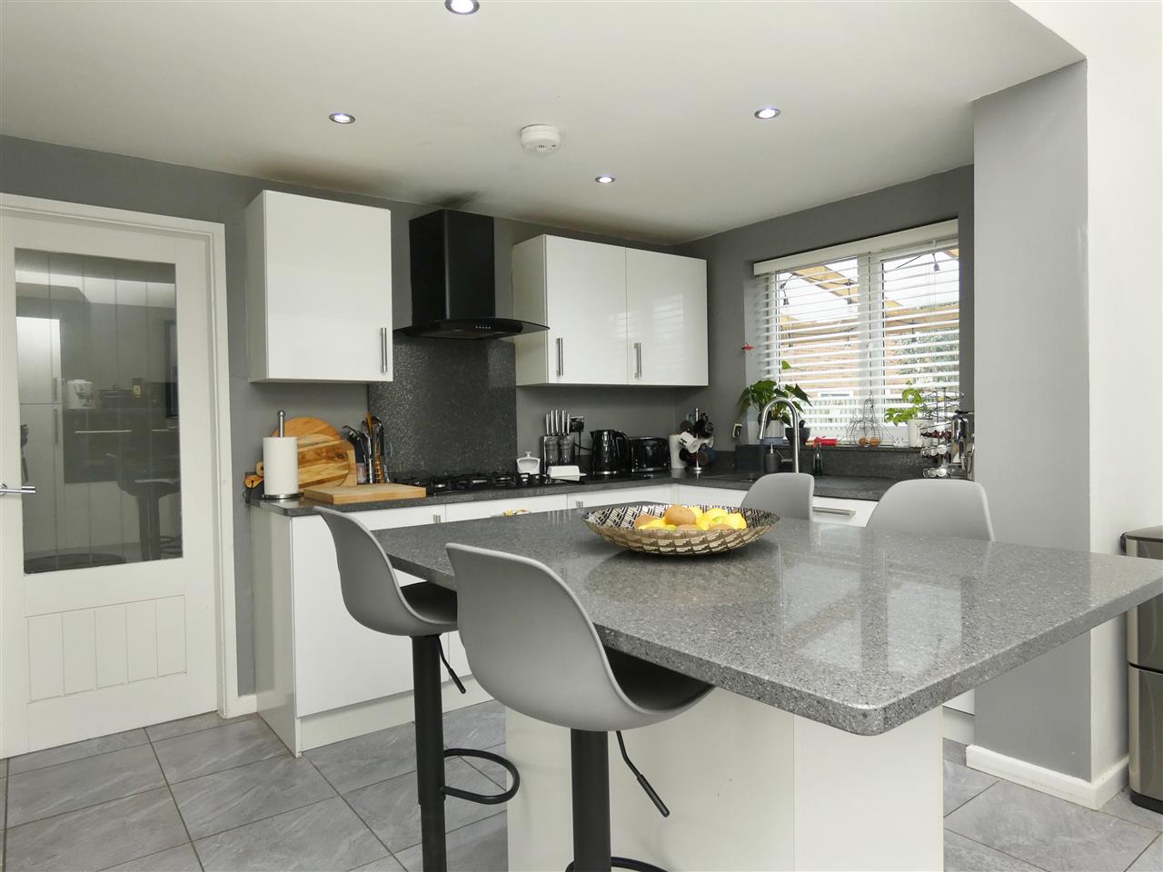 with a range of base and wall units, working surfaces, stainless steel sink, built in oven and hob with extractor hood over, tiled splashbacks, plumbing for washing machine, space for fridge freezer, understairs cupboard, tiled floor, window to the rear elevation, door to side.