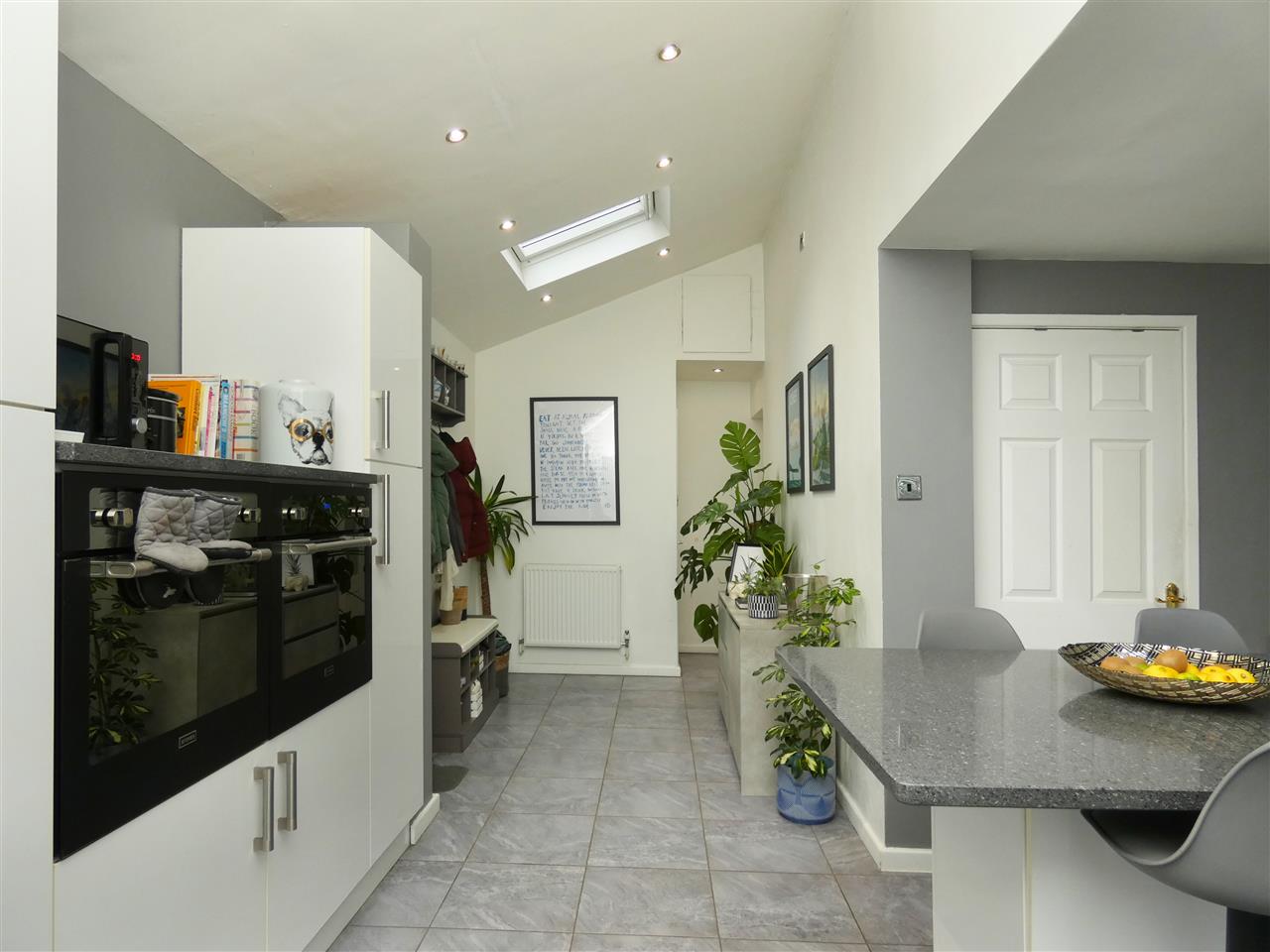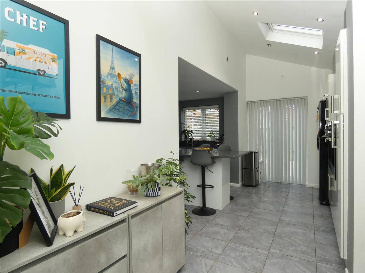 with laminate flooring and open arch through to:-