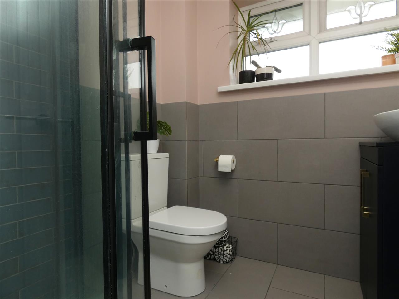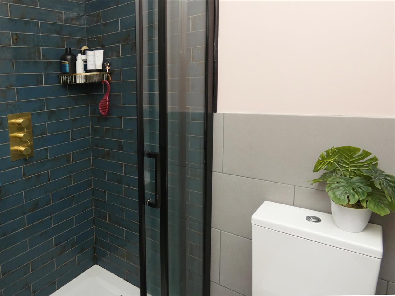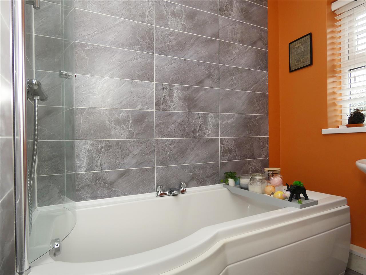 comprising of a P shaped shower bath with glazed screen and Mira fitment over, built in vanity wash hand basin, low level WC and drawers, tiled walls and floor, spot lighting, window to the rear elevation.