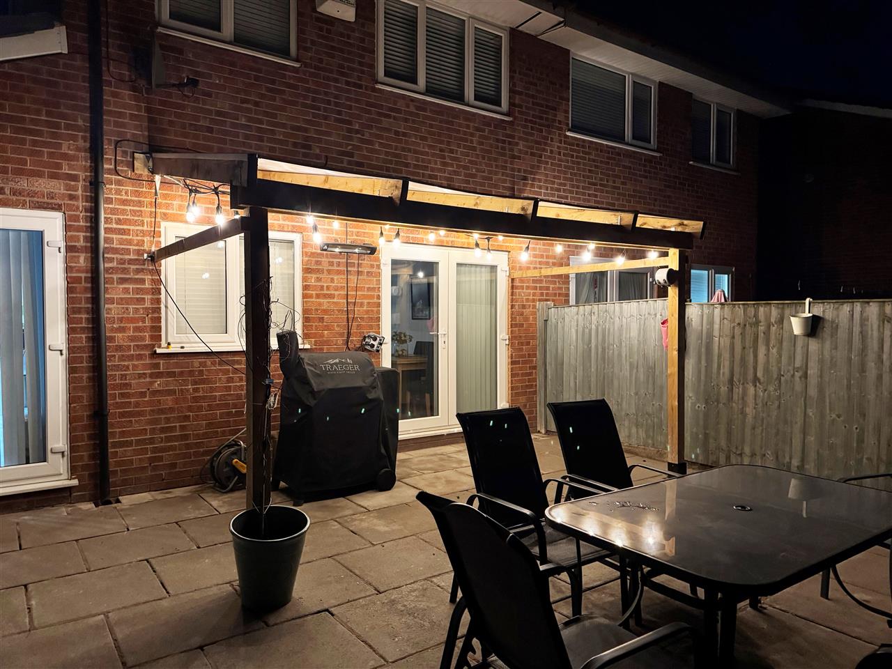 Enclosed garden, laid to lawn with paved patio area.