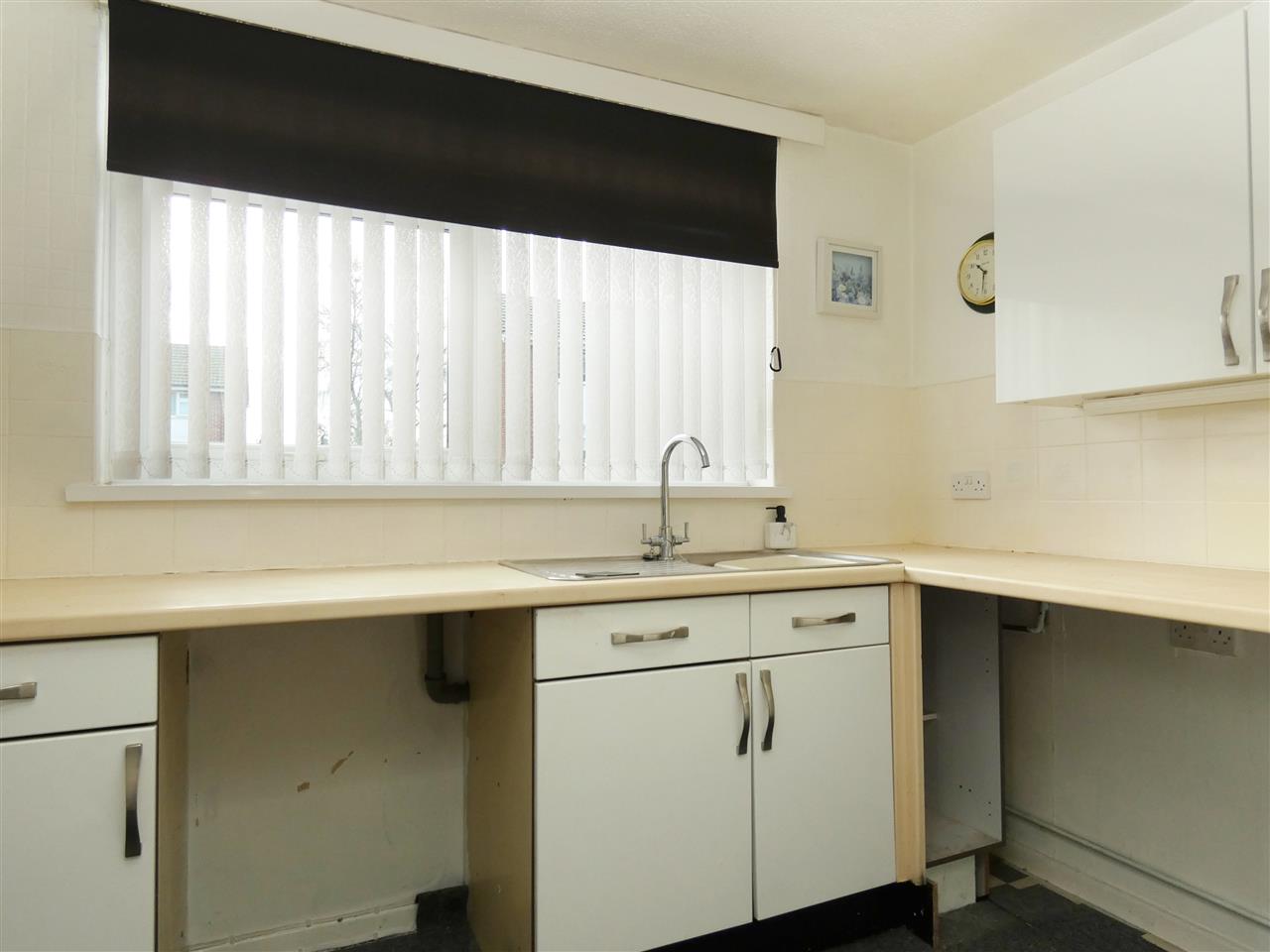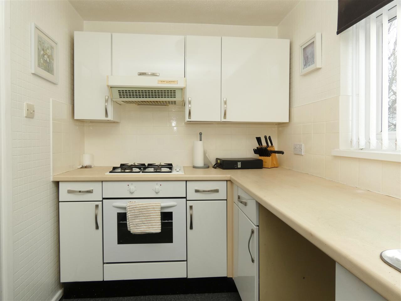 with a range of base and wall units, working surfaces, single drainer stainless steel sink, built in oven and hob with extractor over, plumbing for washing machine, space for fridge and freezer, tiled splashbacks, window to the rear elevation.