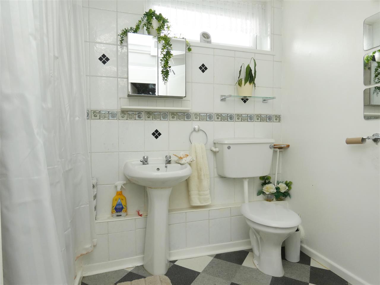 comprising of shower tray with Mira fitment over, pedestal wash hand basin, low level WC, tiled splashbacks, window to the rear elevation.