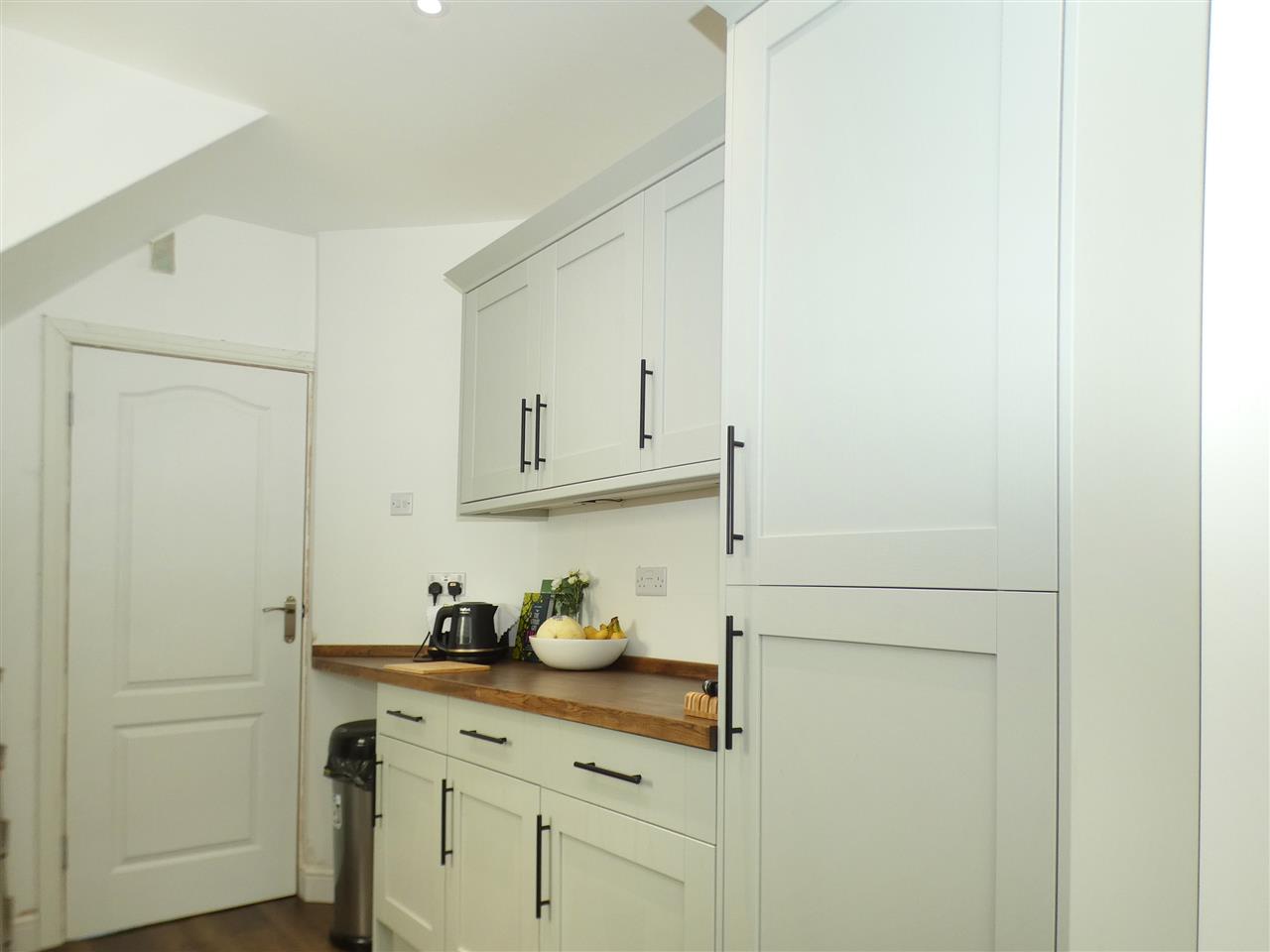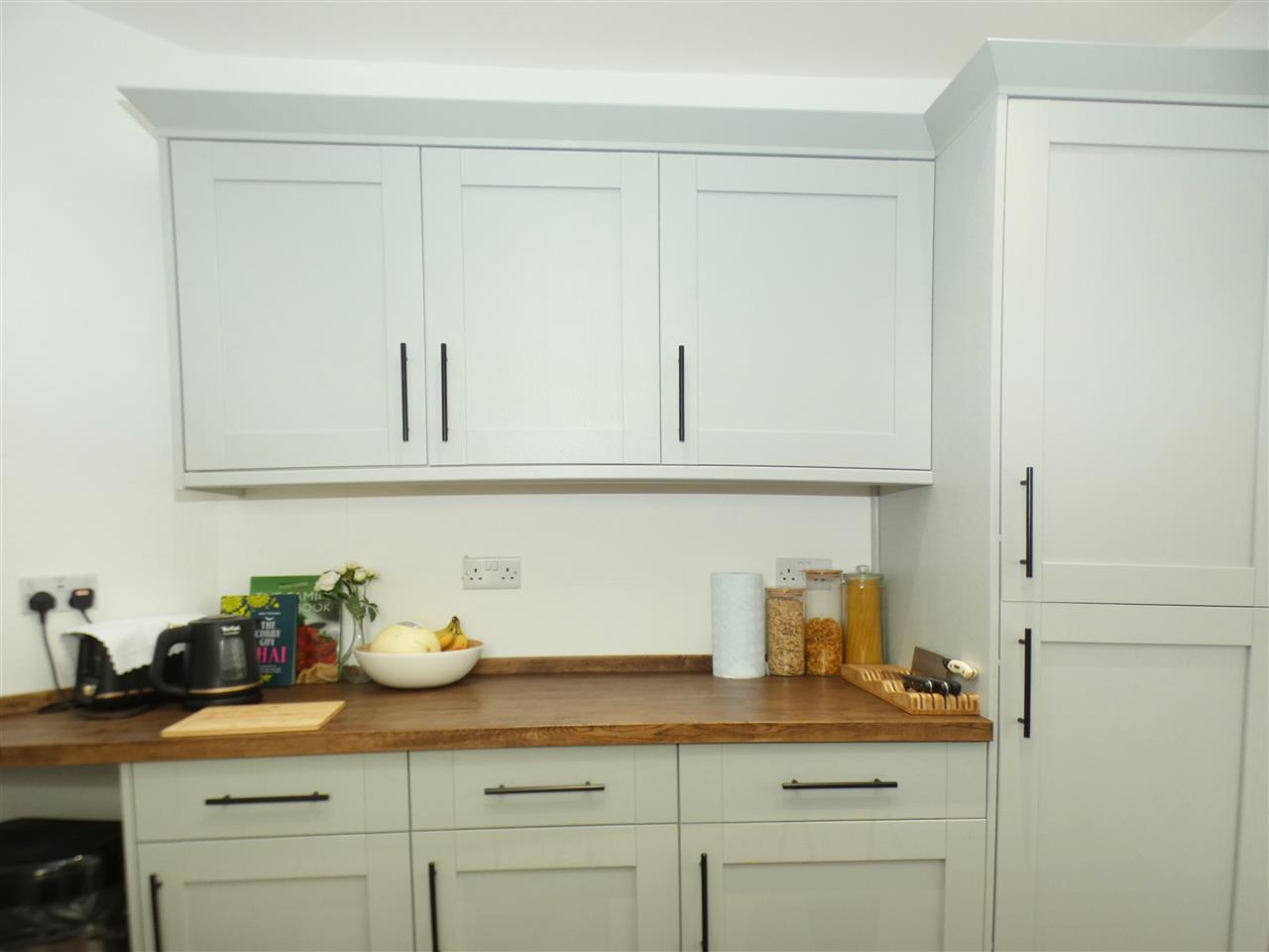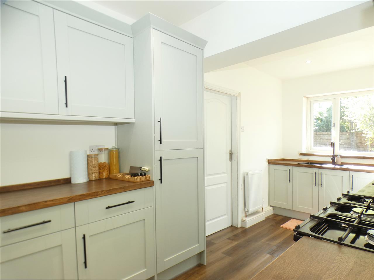 equipped with a matching range of base and wall units, butchers block working surfaces, 1.5 bowl moulded sink unit, integrated fridge freezer, space for range cooker with extractor hood over, plumbing for washing machine and space for dryer, wood effect flooring, spot lighting, windows to the side and rear elevations, understairs cupboard, door to side.