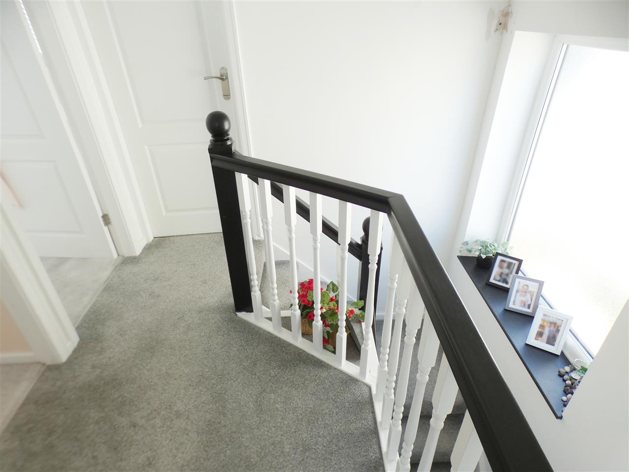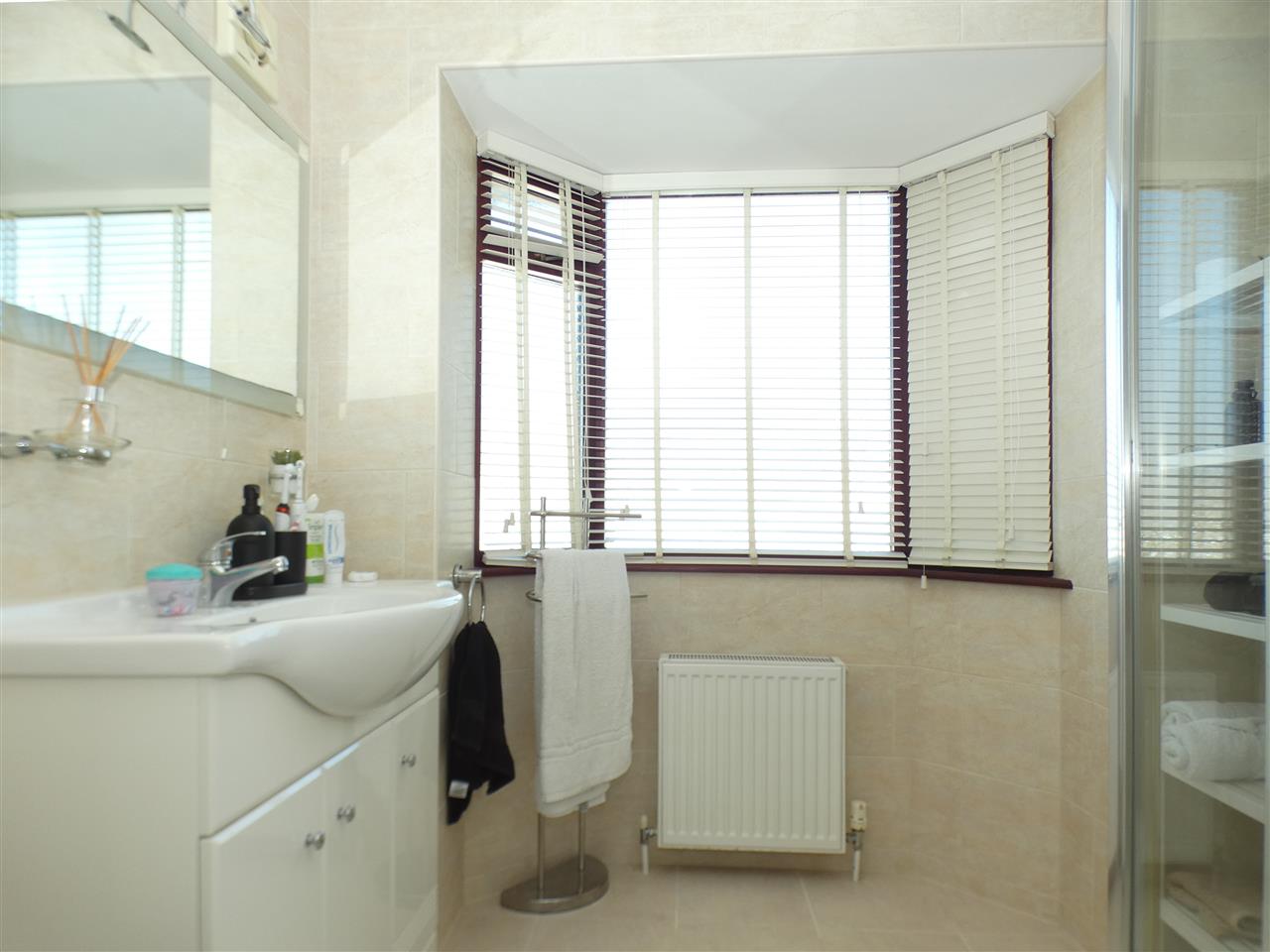 comprising of a three piece suite including walk in glazed shower enclosure, vanity wash hand basin, low level WC, tiled walls and floor, spot lighting and bay window to the front elevation.