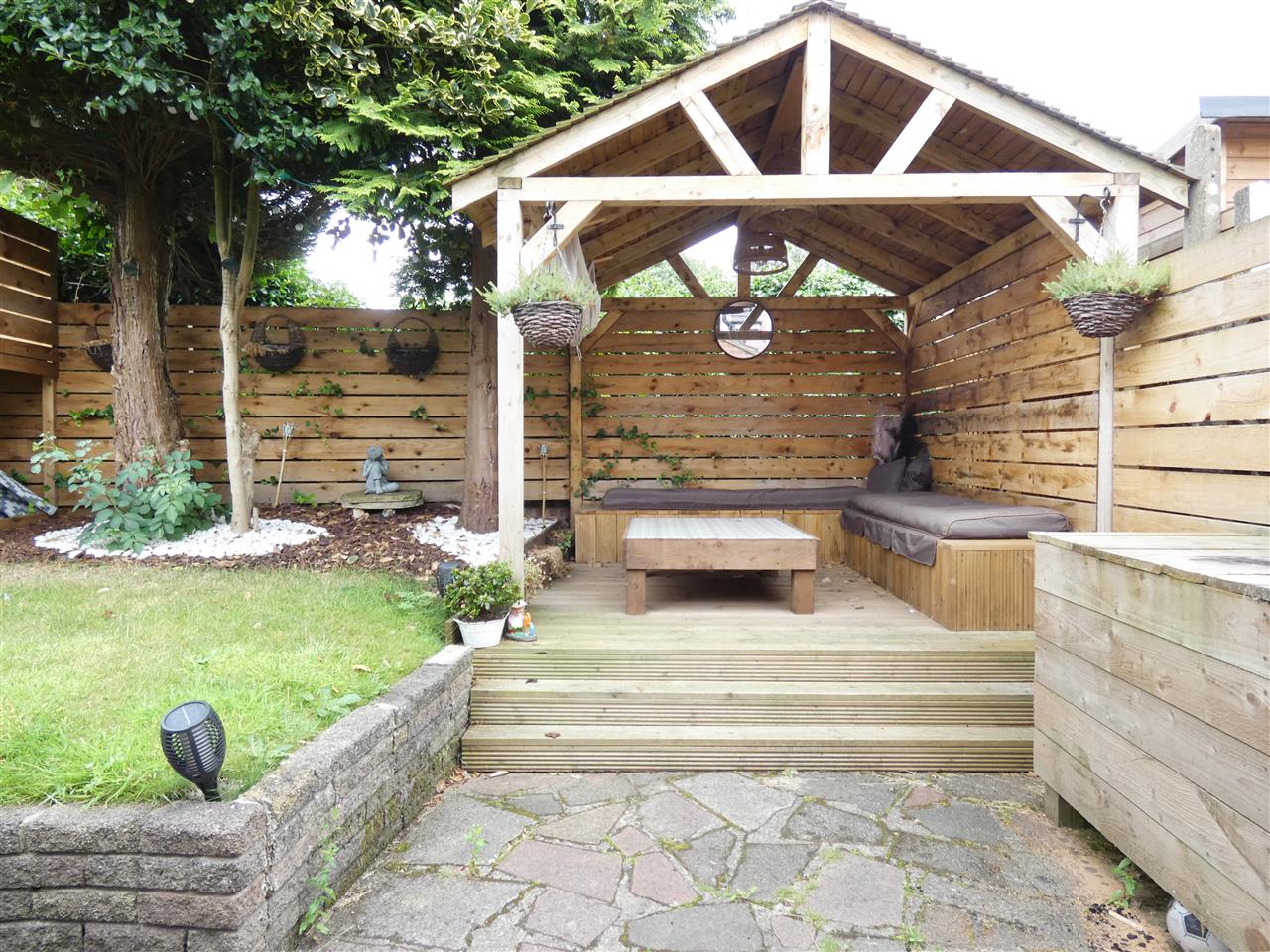 Enclosed garden, laid to lawn with beds and borders, patio area, timber pergola with bench seating.