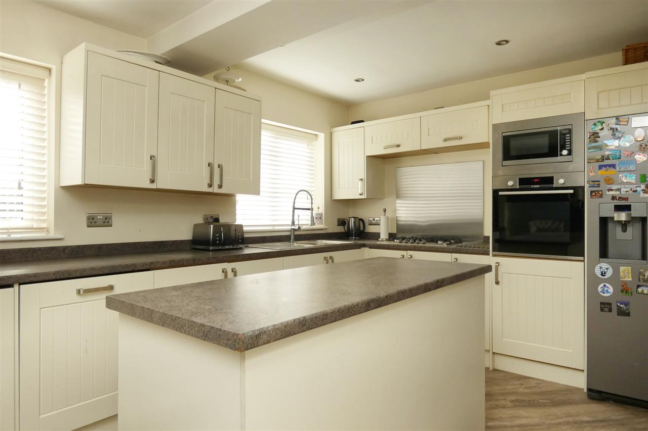 equipped with a matching range of base and wall units, island, working surfaces, 1.5 bowl stainless steel sink, built in oven and hob, integrated microwave, dishwasher, washing machine and tumble dryer, wine fridge, plumbing and space for American style fridge freezer, seating area with panelled and walls and bi-fold doors onto dining room, vertical radiator, two windows to the rear elevation, spot lighting, built in cupboard, Amtico flooring, open through to:-