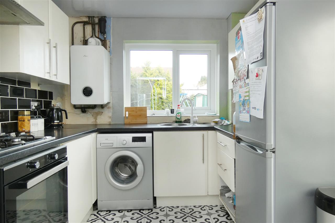 with a range of base and wall units, working surfaces, stainless steel sink, built in oven and hob with extractor hood over, tiled splashbacks, plumbing for washing machine, space for fridge freezer, understairs cupboard, tiled floor, window to the rear elevation, door to side.