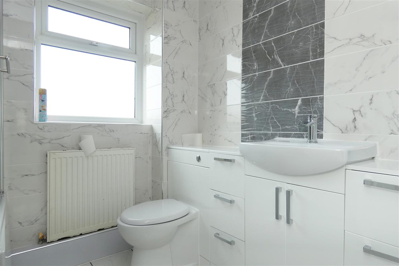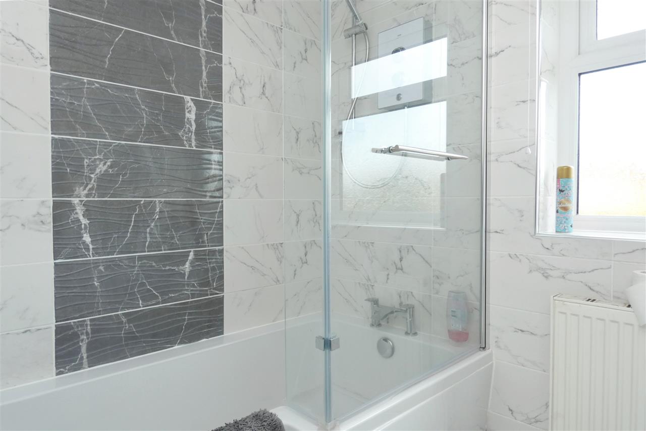 comprising of a P shaped shower bath with glazed screen and Mira fitment over, built in vanity wash hand basin, low level WC and drawers, tiled walls and floor, spot lighting, window to the rear elevation.