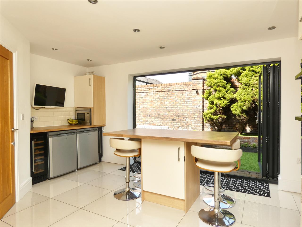 equipped with a matching range of base and wall units, butchers block effect working surface, built in double oven, gas hob with chimney style extractor hood over, 1.5 bowl stainless steel sink island with breakfast bar seating, space for fridge and freezer, tiled splashbacks, tiled floor, spot lighting, windows to the front and rear elevations, bi-fold doors onto rear garden.