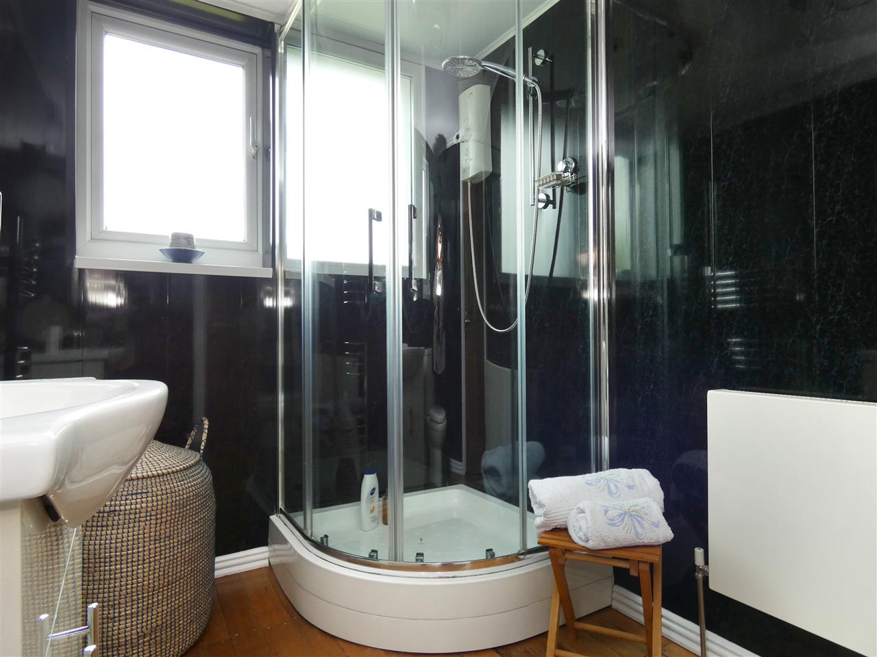 comprising of a three piece suite including shower cubicle with Mira fitment, vanity wash hand basin, low level WC, heated chrome towel radiator, stripped floor boards, uPVC panelled walls and ceiling, windows to the side and rear elevations.
