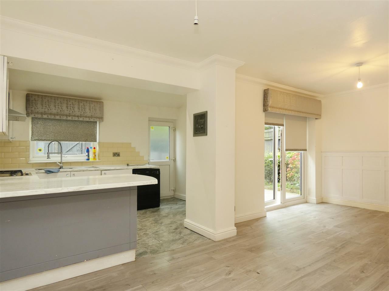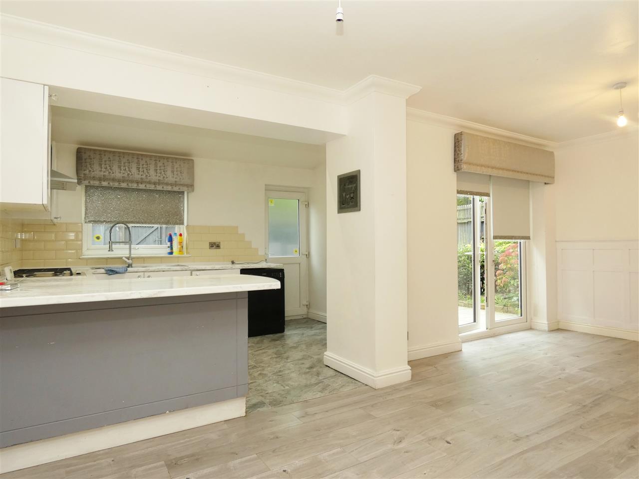 overall, kitchen equipped with a range of base and wall units, working surfaces, 1.5 bowl stainless steel sink, built in oven and hob, tiled splashbacks, tiled floor, breakfast bar, Velux window, window and door to the rear elevation, dining area with laminate flooring, understairs cupboard and French doors onto garden.