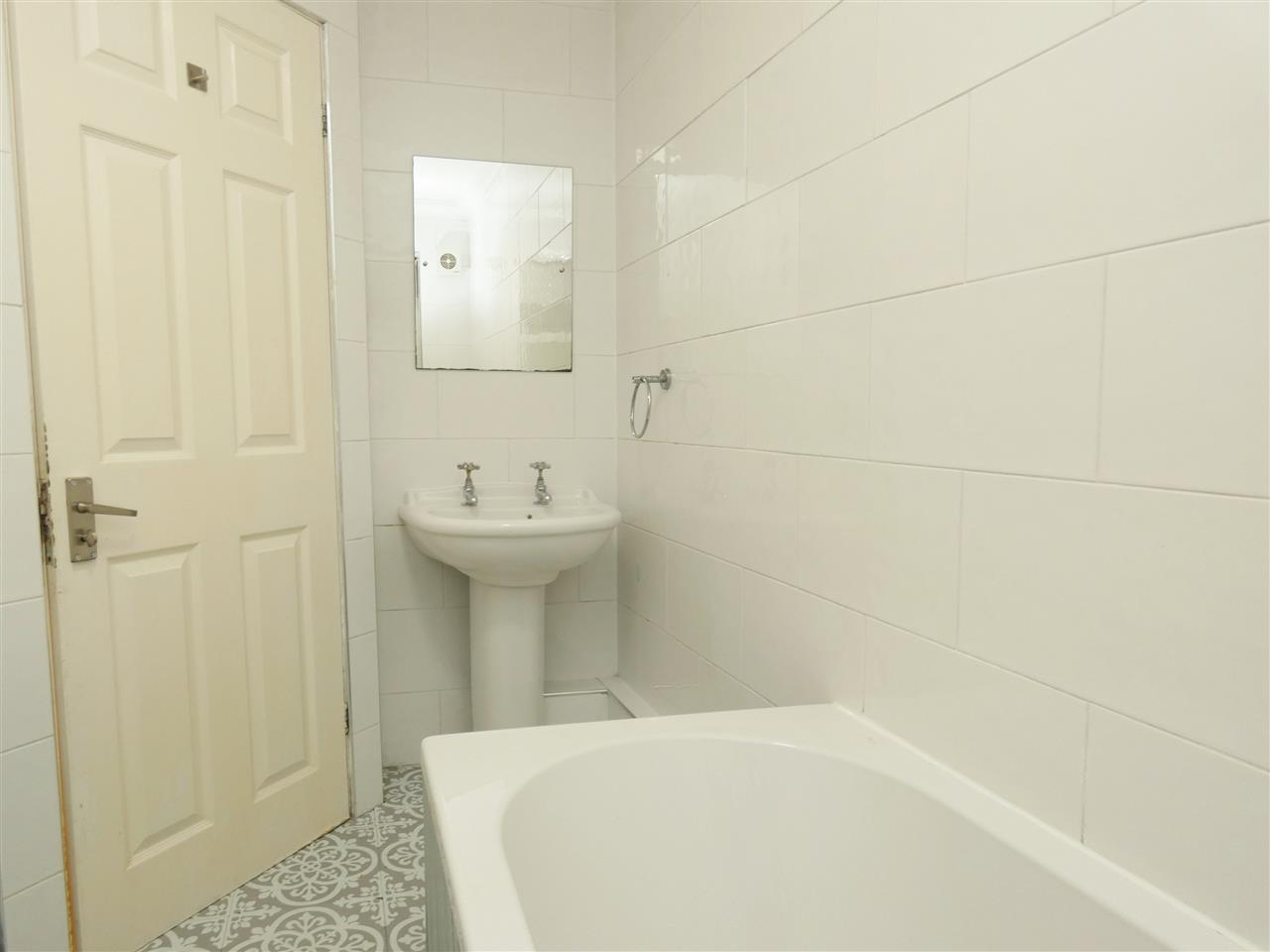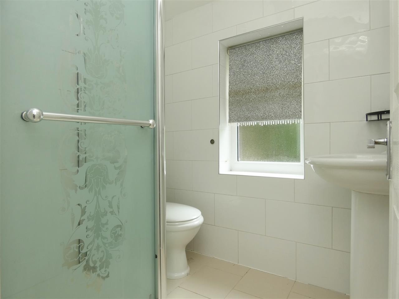 comprising of a shower cubicle with Triton fitment, pedestal wash hand basin, low level WC, tiled walls and floor, window to rear elevation
