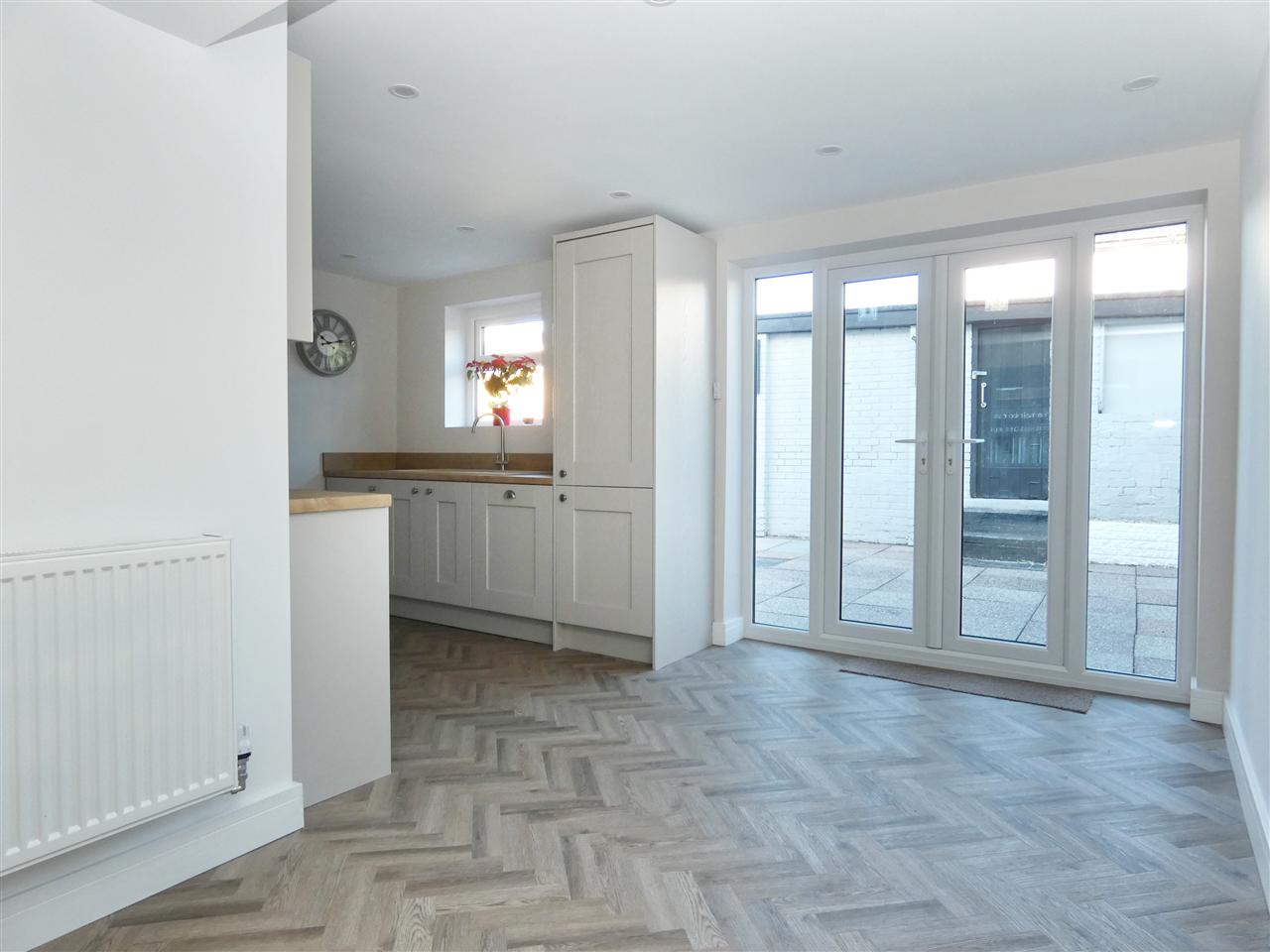 L-shaped room with dining area, herringbone flooring throughout, kitchen area equipped with a modern range of base and wall units, butchers block effect working surfaces and up stands, single drainer moulded sink unit, built in oven and hob with extractor hood over, integrated fridge freezer and dishwasher, window to the side elevation and French doors onto garden.