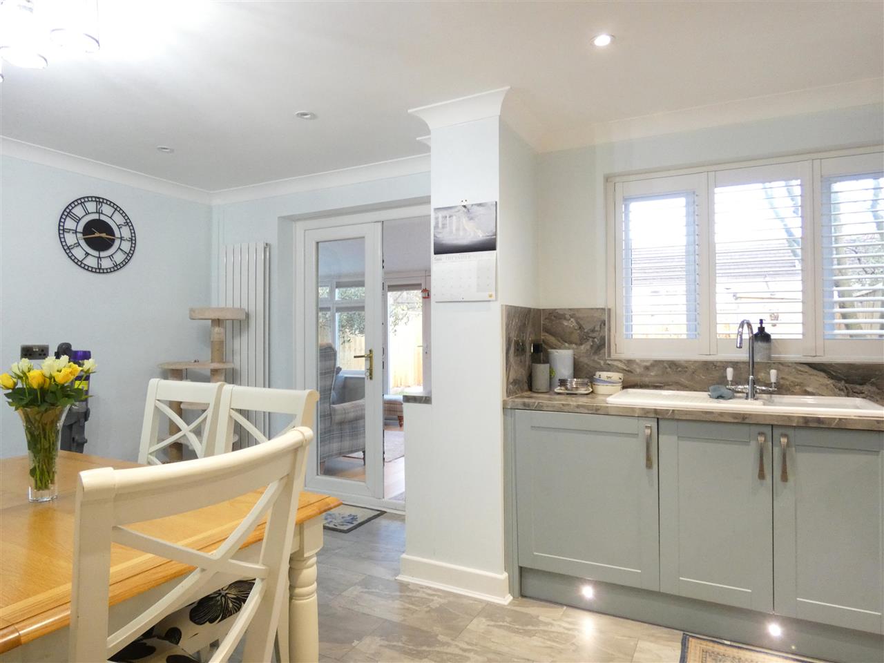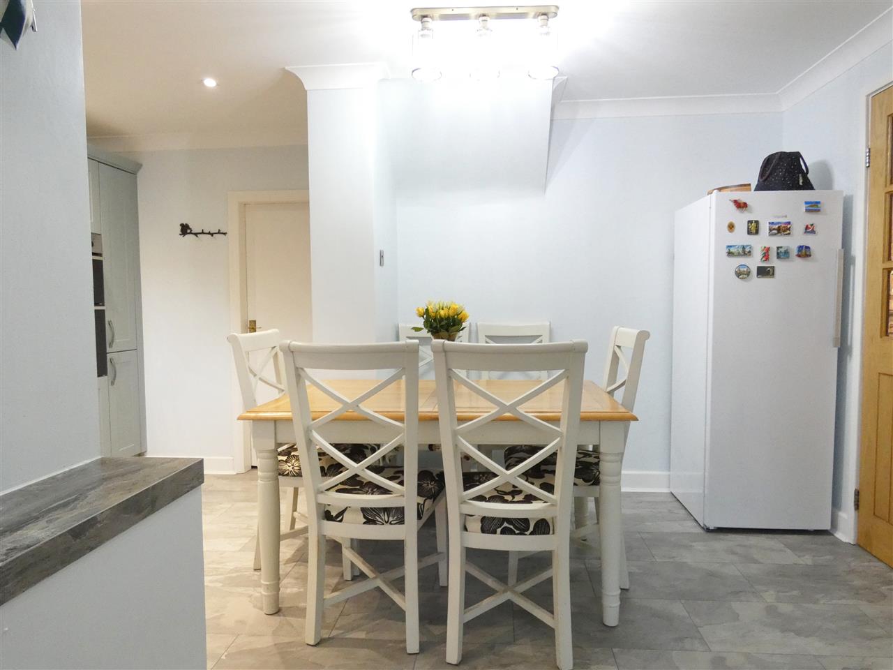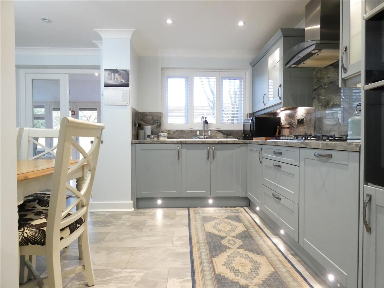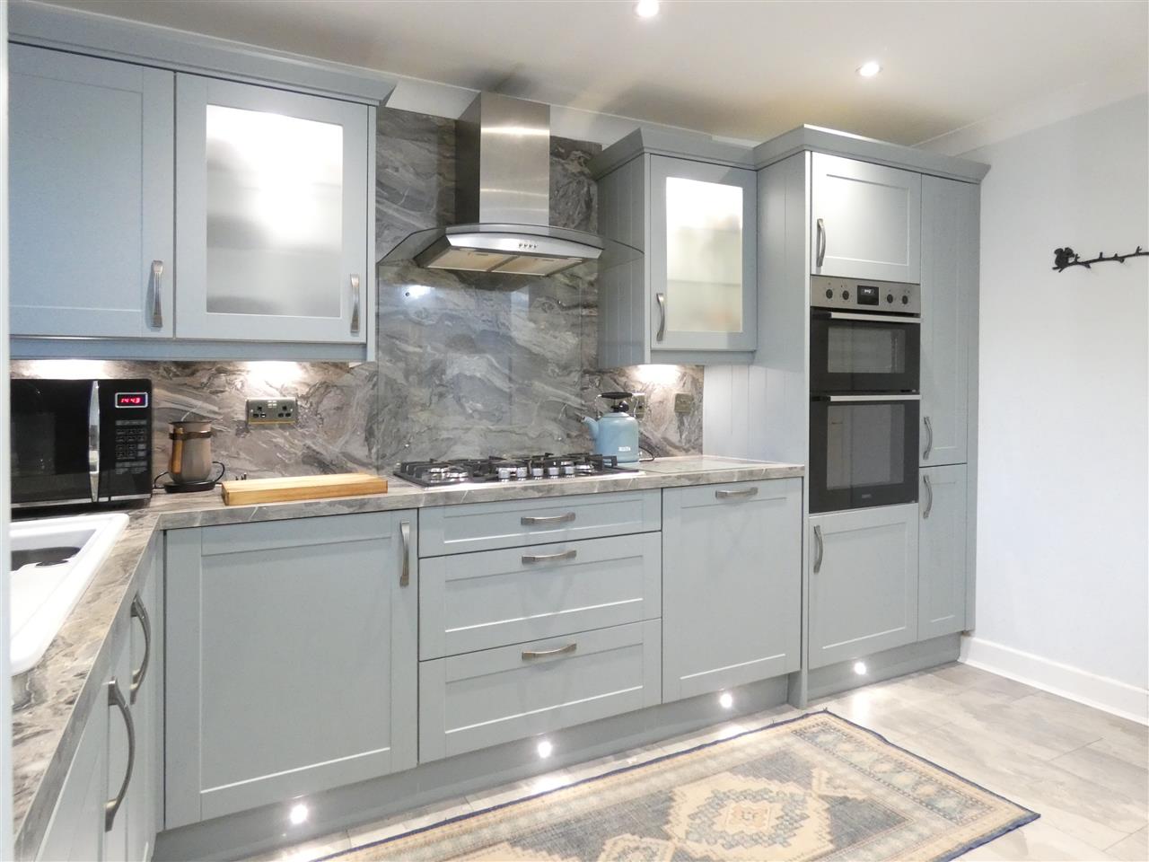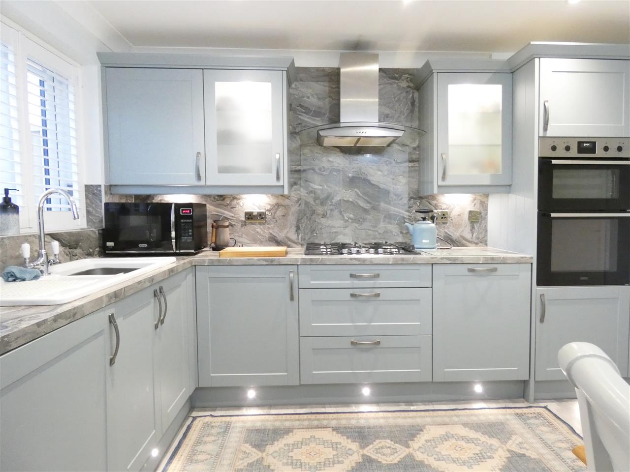 equipped with a matching range of base and wall units, working surfaces and matching splashbacks, 1.5 bowl ceramic sink unit, built in double oven and five burner gas hob with extractor hood over, integrated dishwasher and washing machine, kick board and under cabinet lighting, window to the rear elevation with plantation shutter, personal door to garage, space for table and chairs, French doors onto conservatory.
