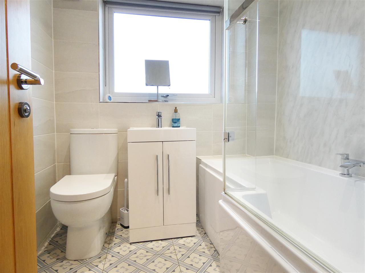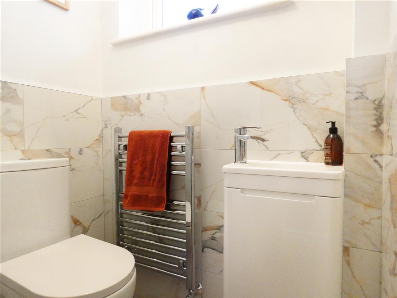 comprising of a low level WC, vanity wash hand basin, part tiled walls, tiled floor, heated chrome towel radiator and window to the side elevation.