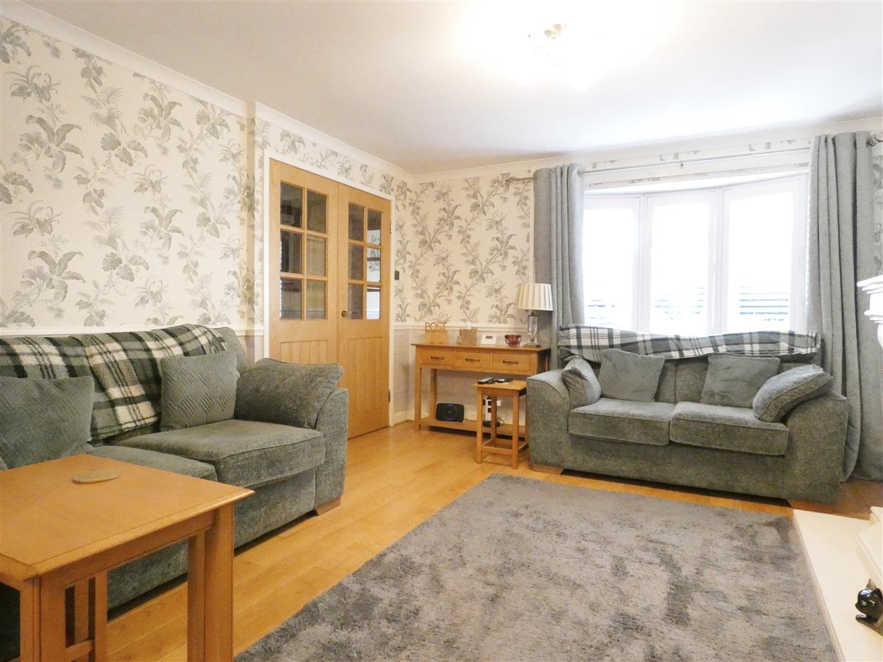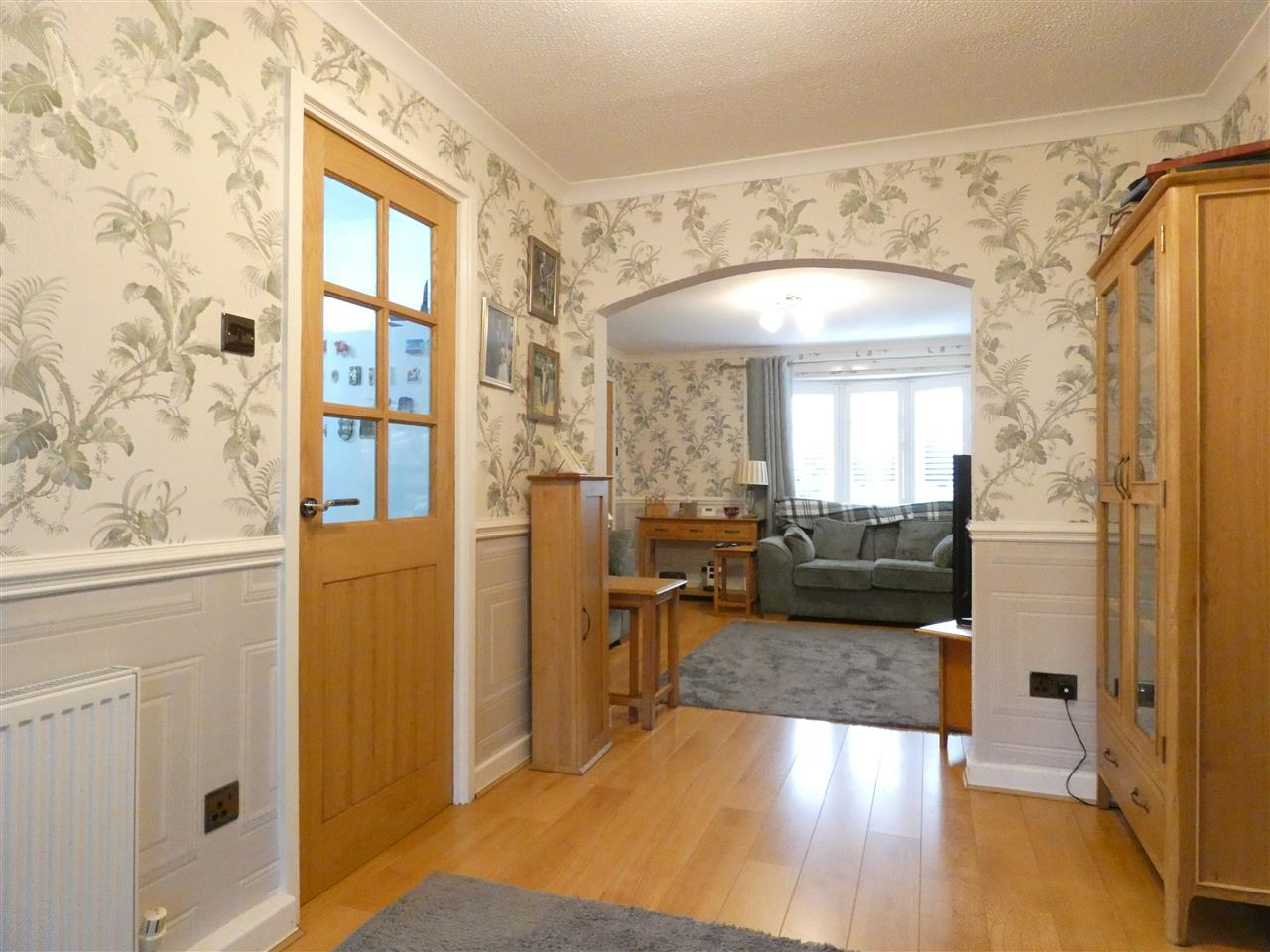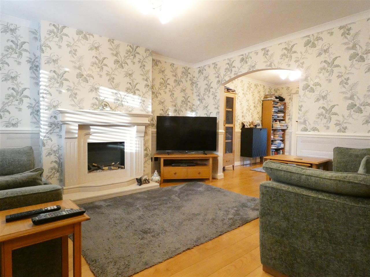 with feature fireplace incorporating electric fire, dado rail, laminate flooring, window to the front elevation with plantation shutter, open through to:-