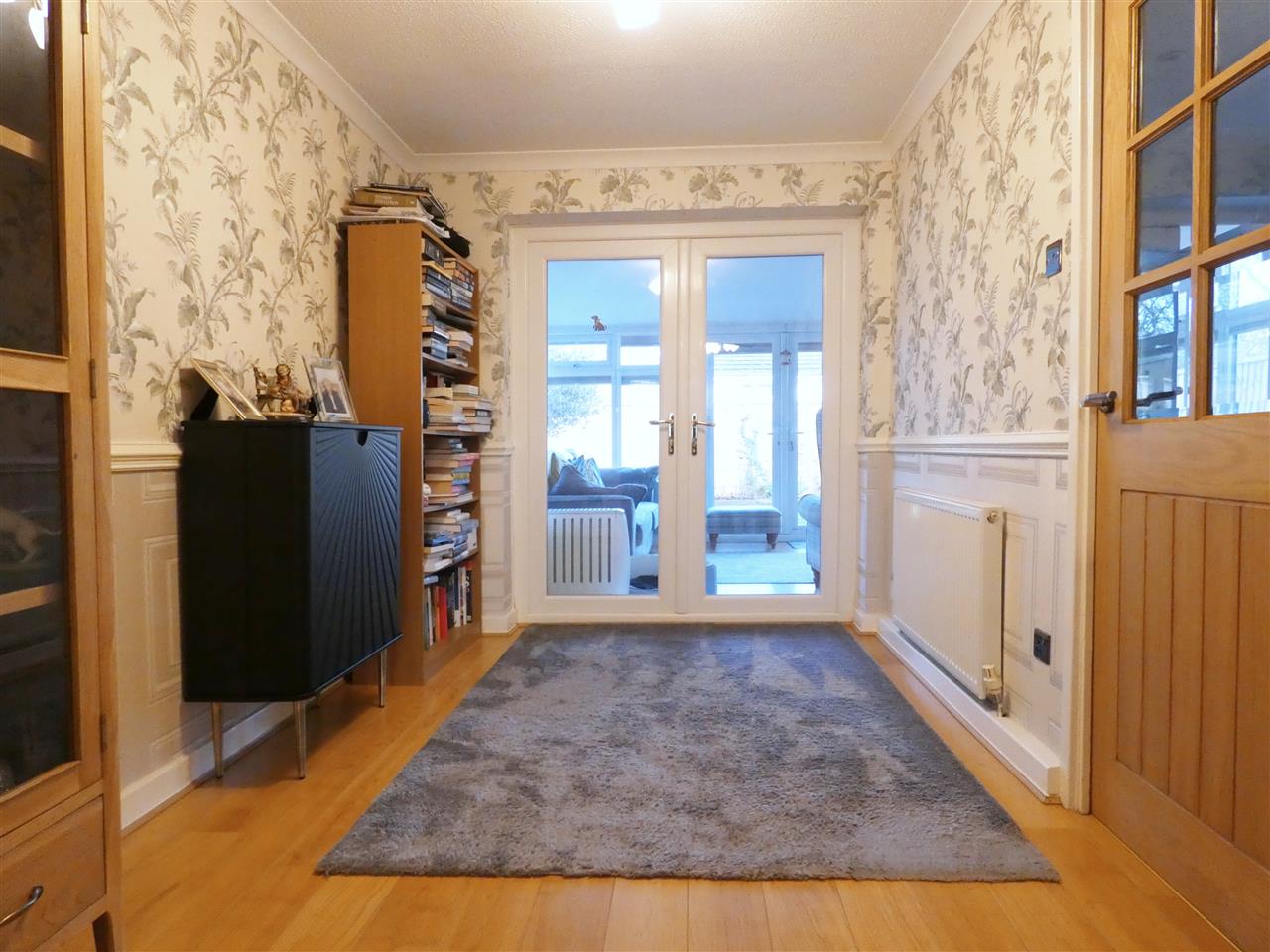 with dado rail, laminate flooring, French doors to conservatory, and door to:-