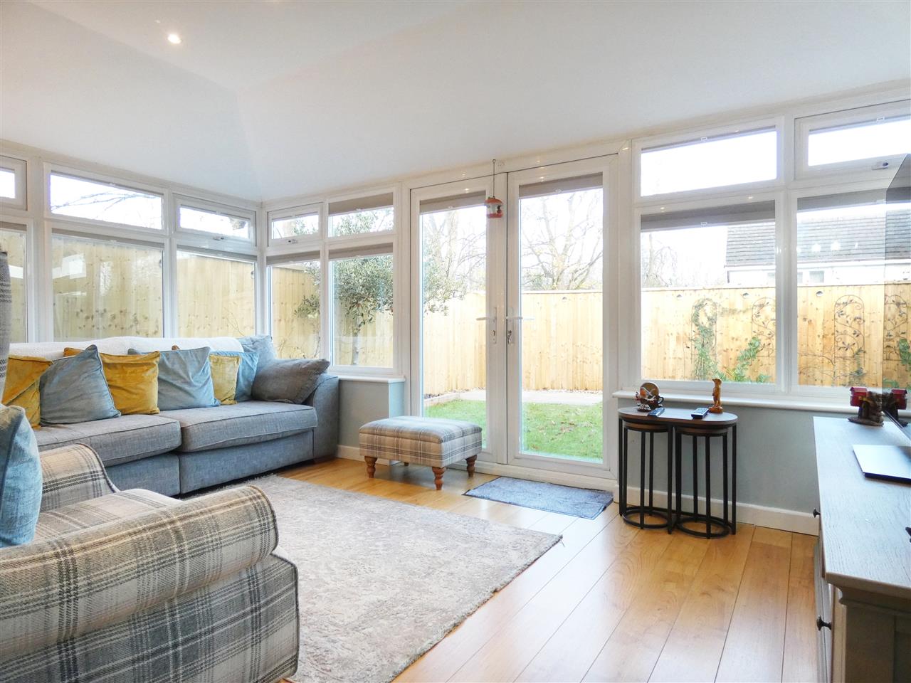 with insulated roof, spot lighting, laminate flooring and French doors onto garden.