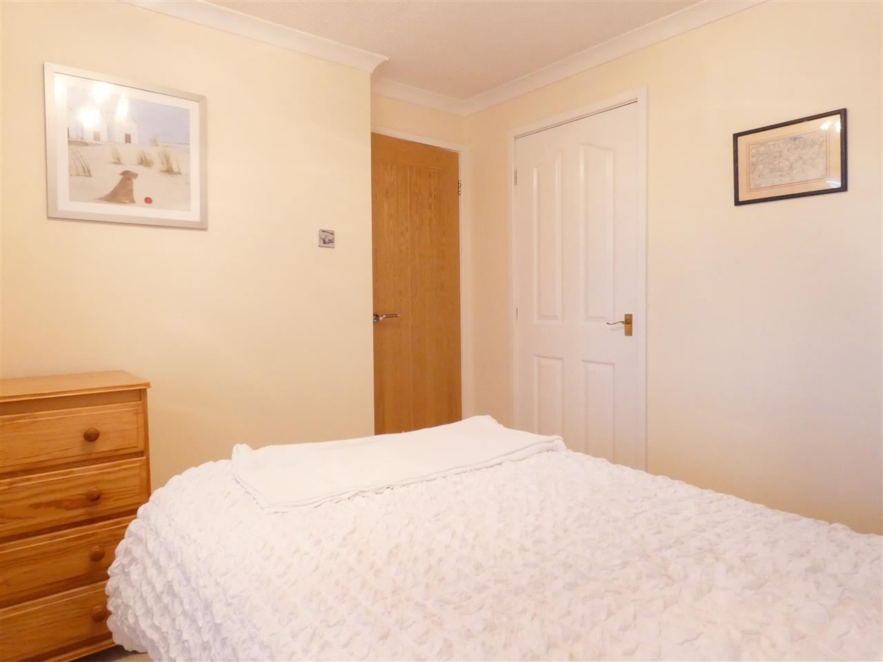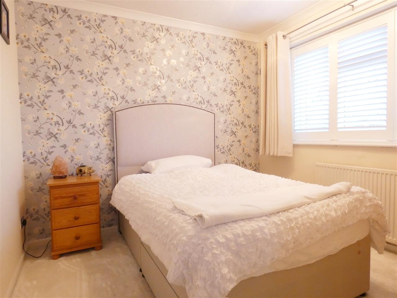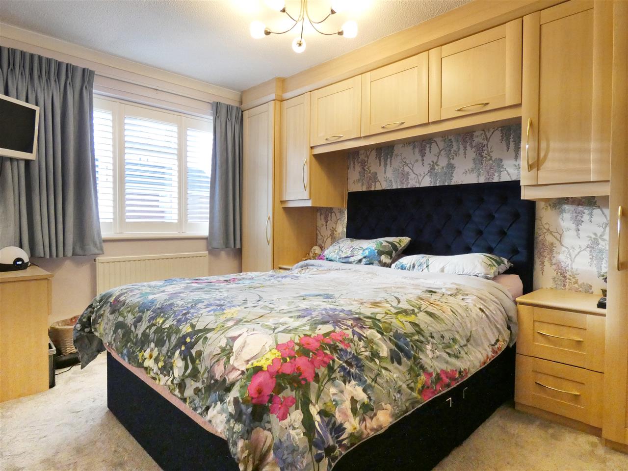 with a range of fitted wardrobes and drawers, window to the front elevation with plantation shutter.