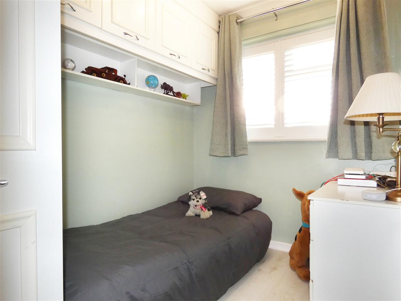 with built in cupboard, laminate flooring and window to the front elevation with plantation shutter.
