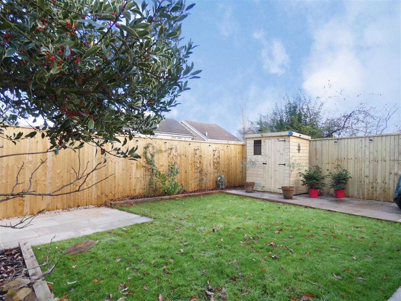 Enclosed garden, laid to lawn with paved patio areas and timber shed.