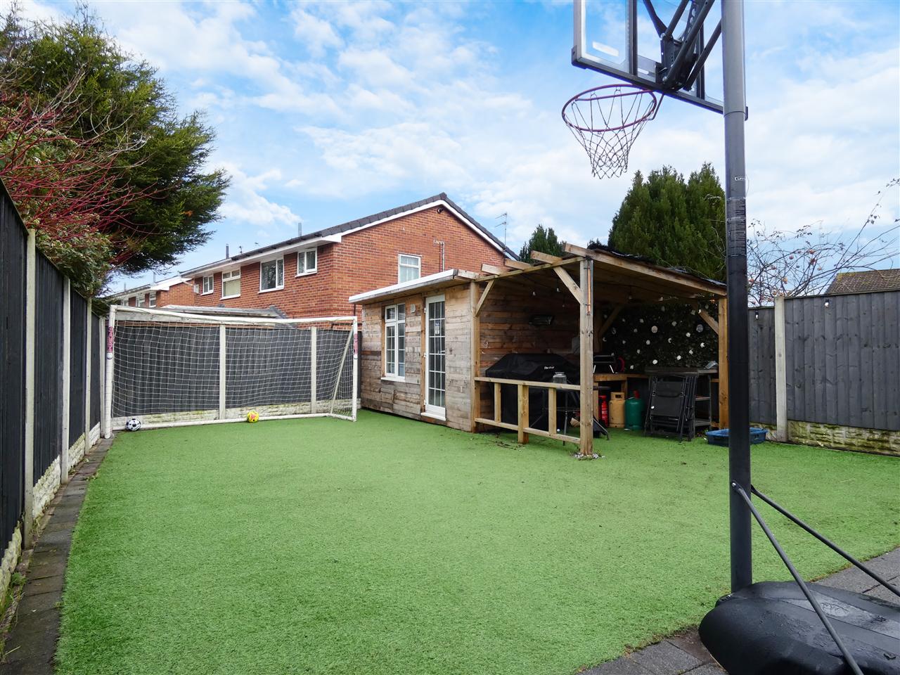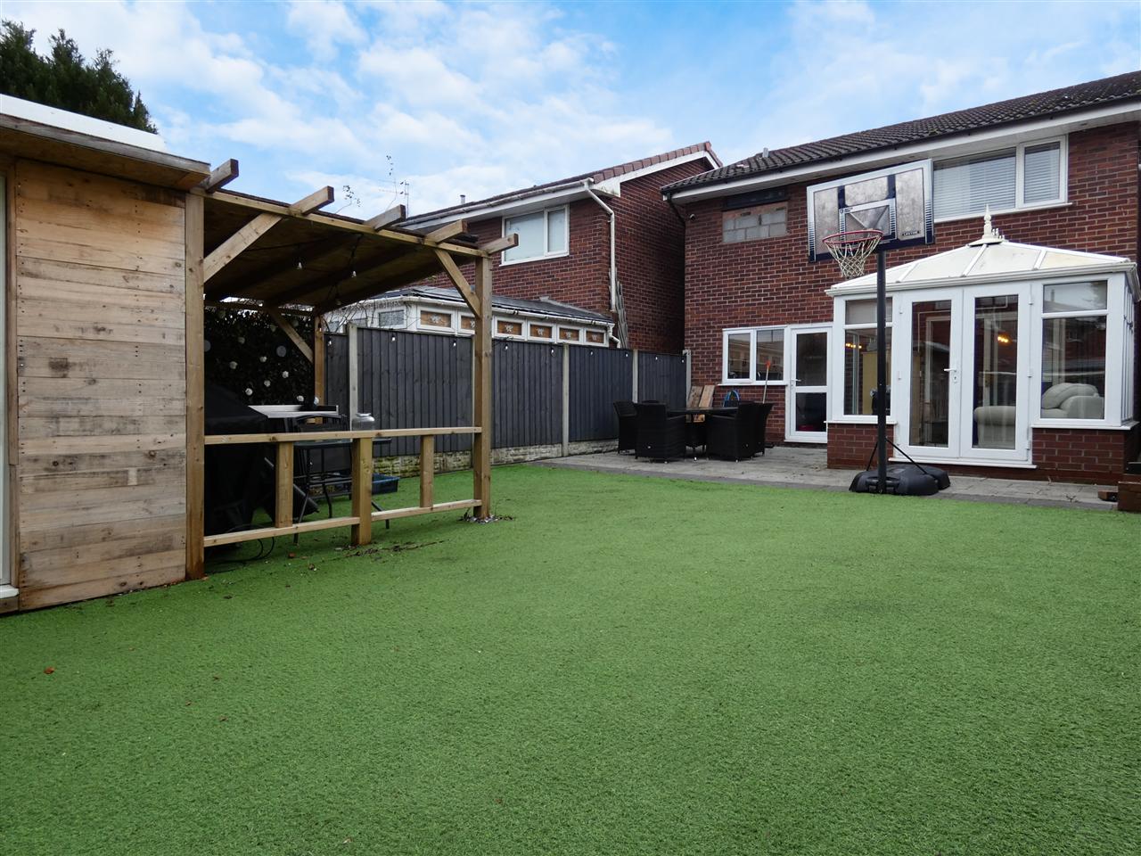 Enclosed low maintenance garden with paved patio area, artificial lawn, timber shed with light and power laid on, pergola, IP rated outside sockets.