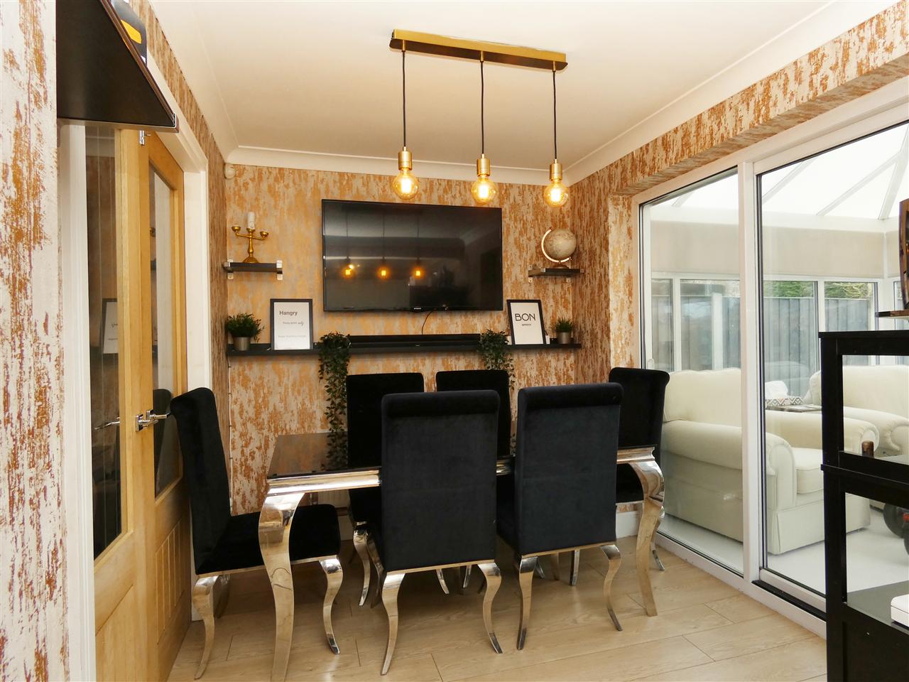 with laminate floor, pedant lighting, sliding patio doors to conservatory and open through to:-