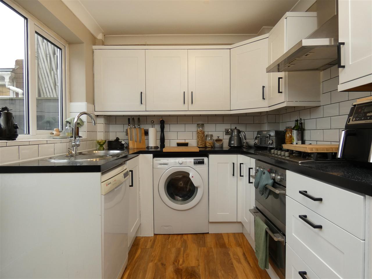 equipped with a matching range of base and wall units, working surfaces, single drainer stainless steel sink, built in double oven and five burner gas hob with extractor hood over, plumbing for washing machine and dishwasher, tiled splashbacks, laminate flooring, window and door to the rear elevation.