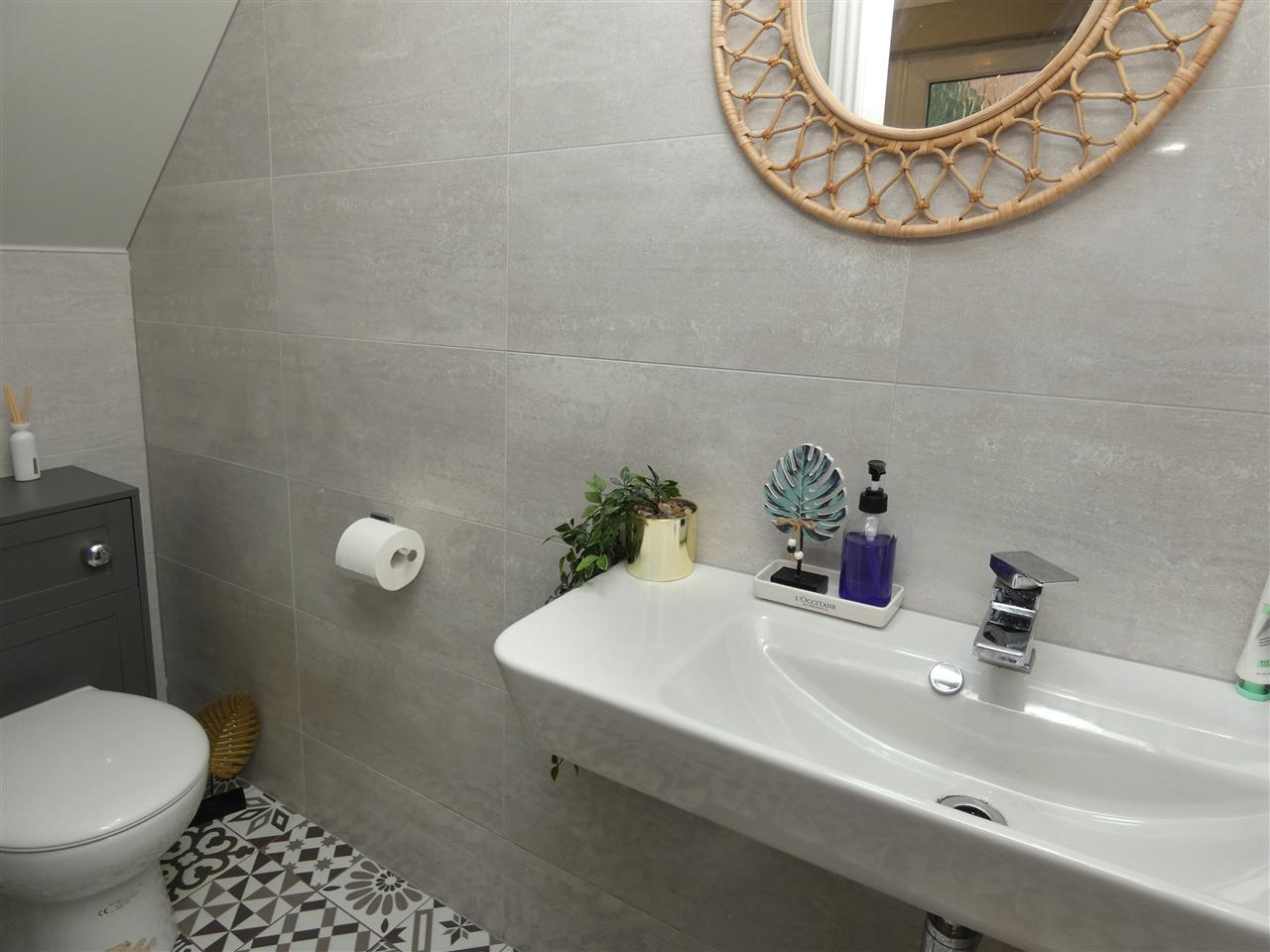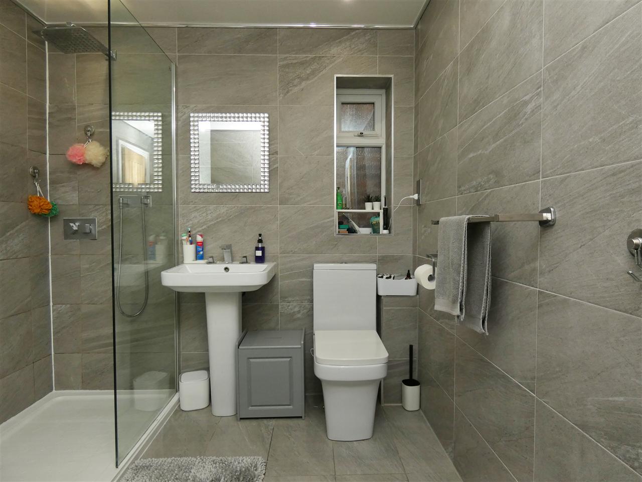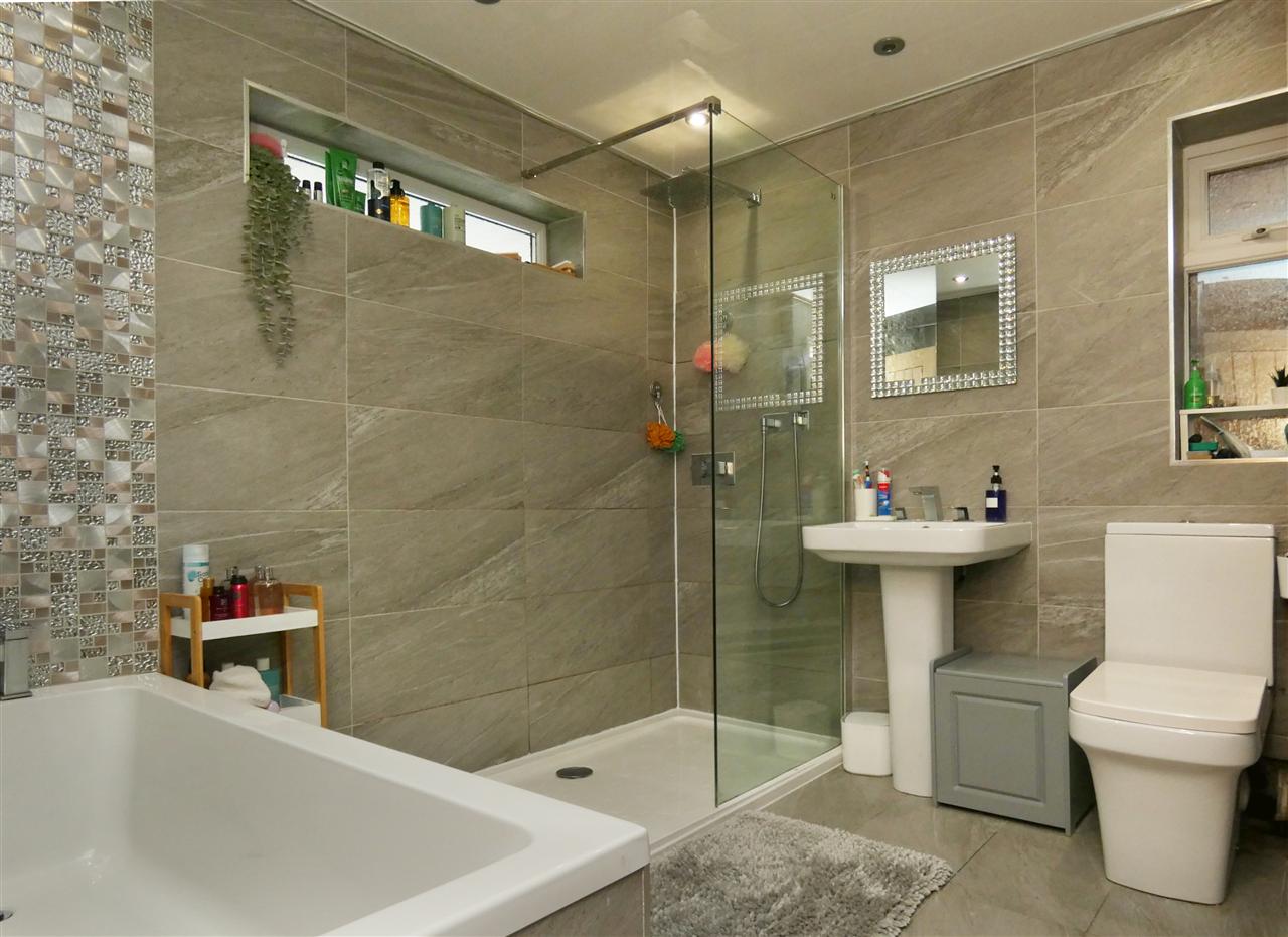 comprising of a modern four piece suite including bath with tiled surround, walk in shower with rainwater fitment, pedestal wash hand basin, low level WC, tiled walls and floor, spot lighting, windows to the side and rear elevations.