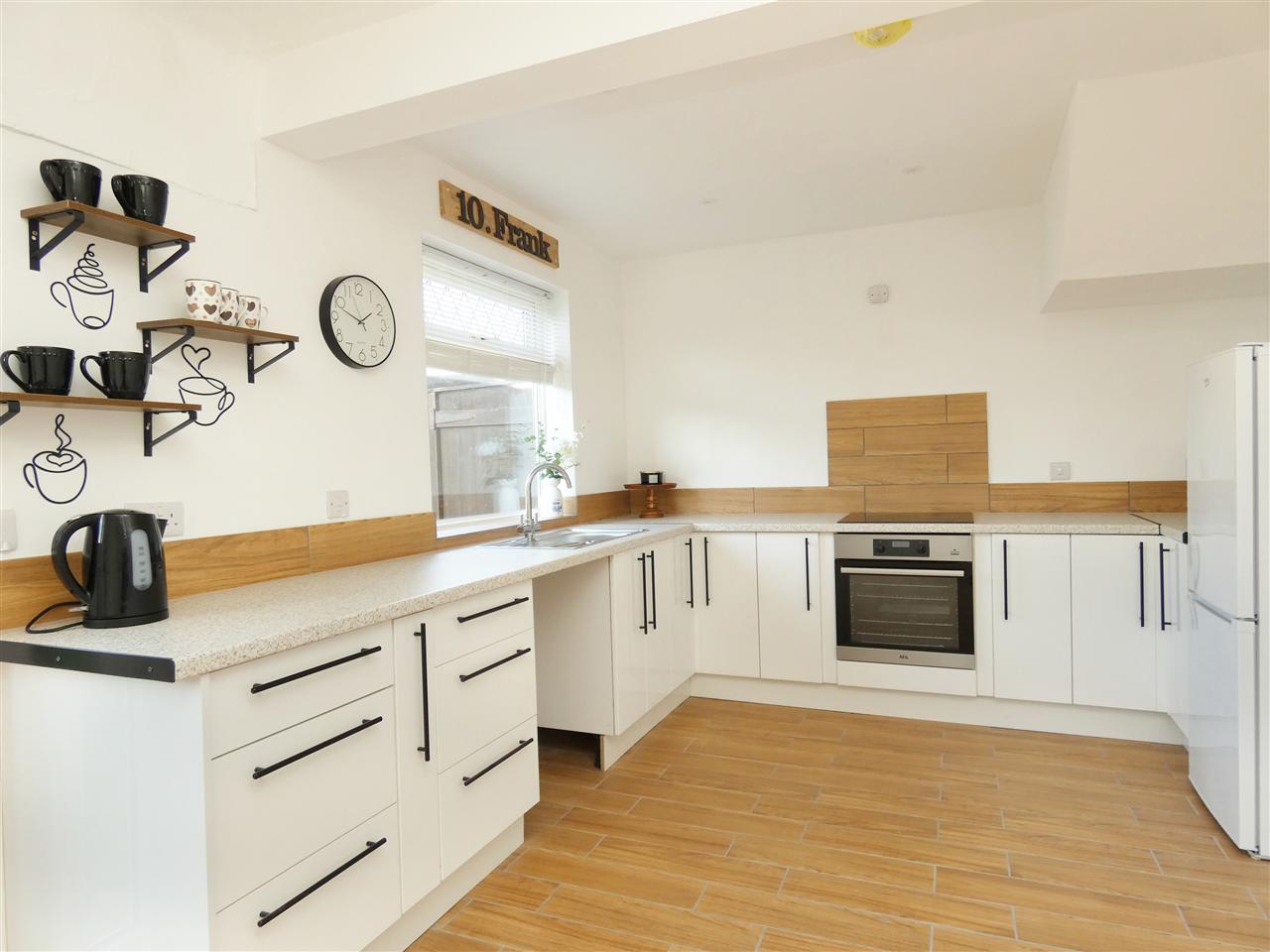 equipped with a matching range of base units, working surfaces, single drainer stainless steel sink, built in oven and hob, plumbing for washing machine, tiled splashbacks, tiled floor, spot lighting to the kitchen area, built in cupboards and wall light points in the dining area, electric heater, window and French doors onto the rear garden.