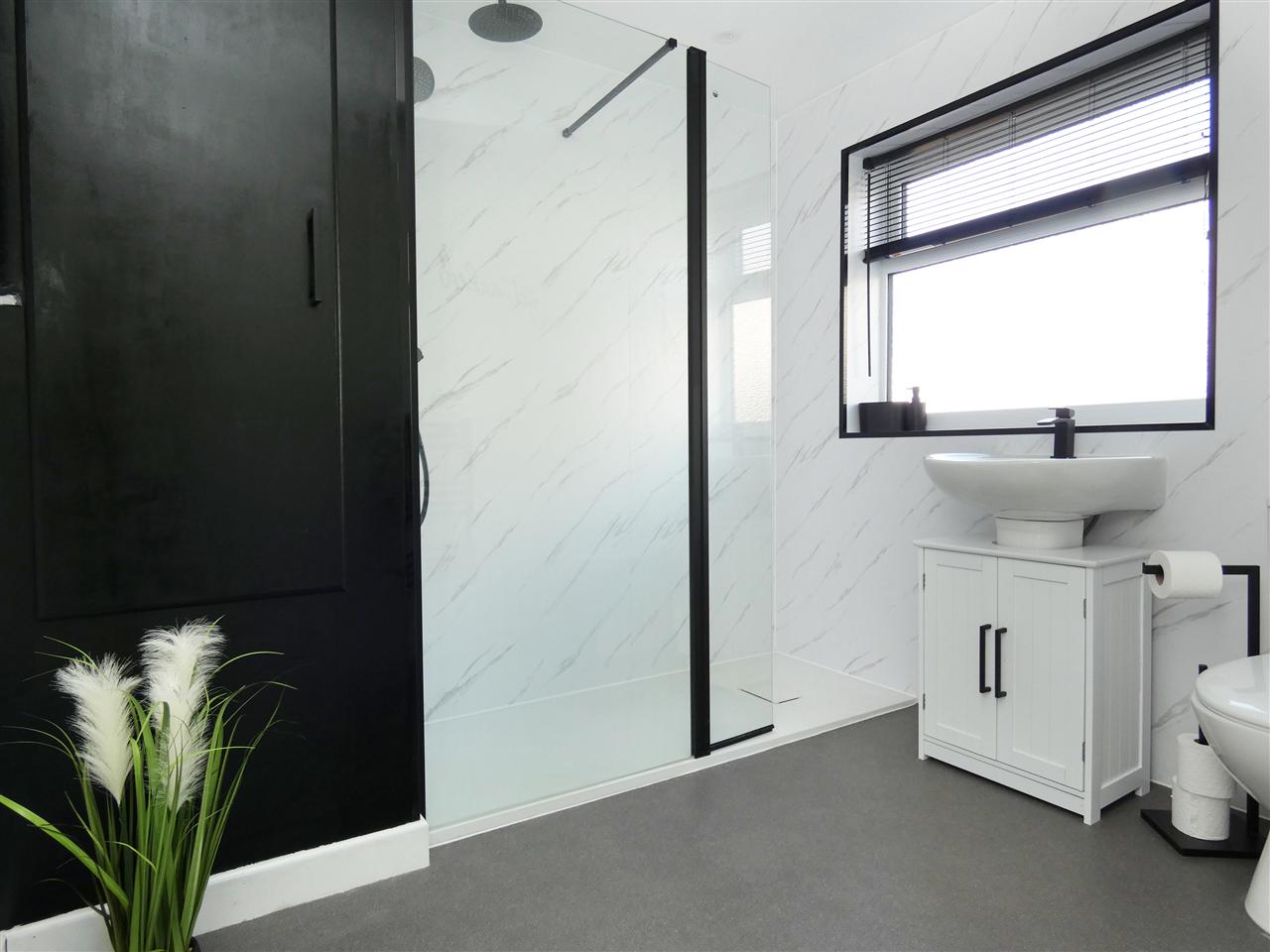comprising of a three piece suite including walk in shower cubicle with glazed screen and rainwater shower fitment, pedestal wash hand basin, low level WC, built in cupboard, electric towel radiator, spot lighting, window to the side elevation.