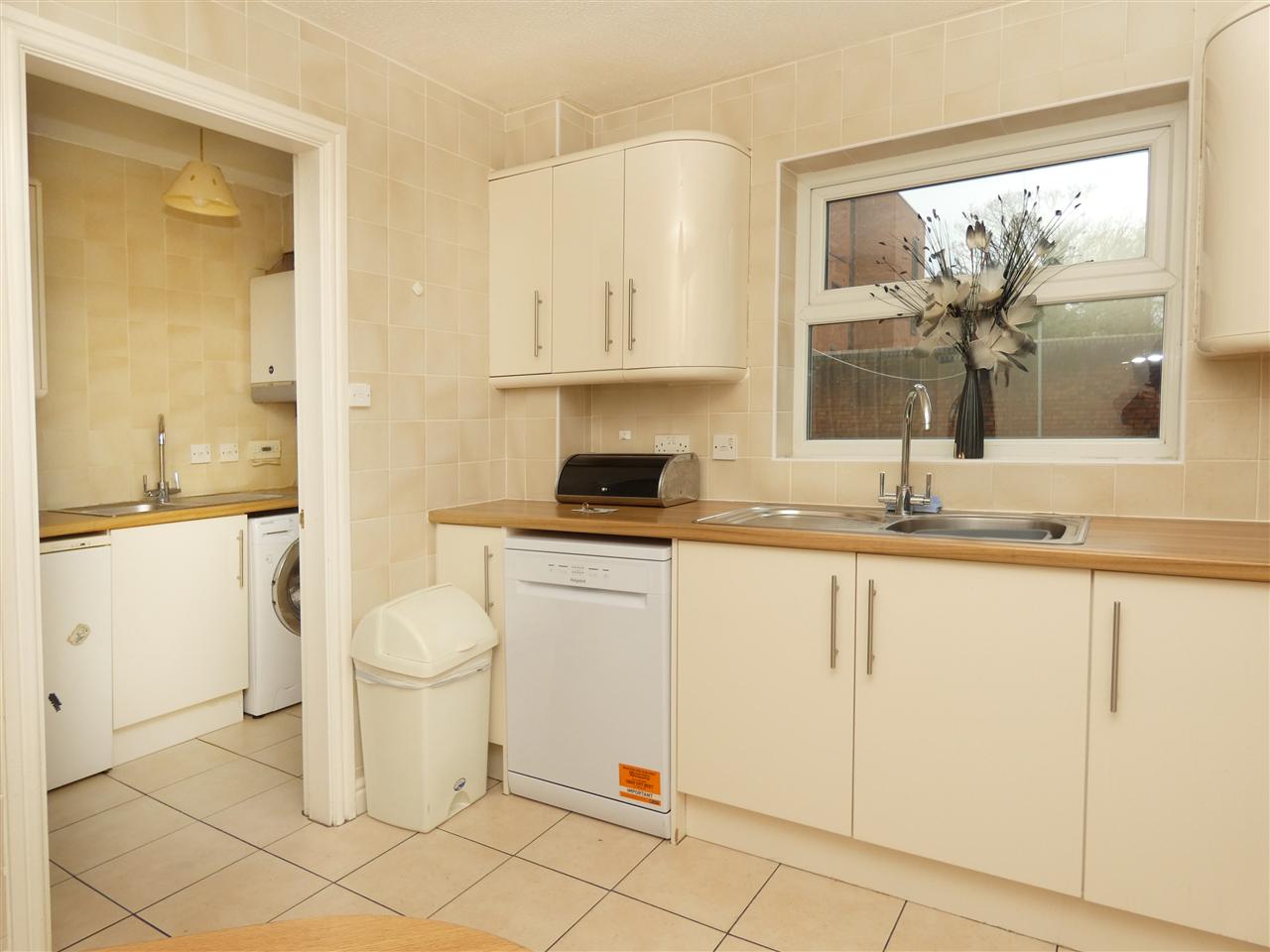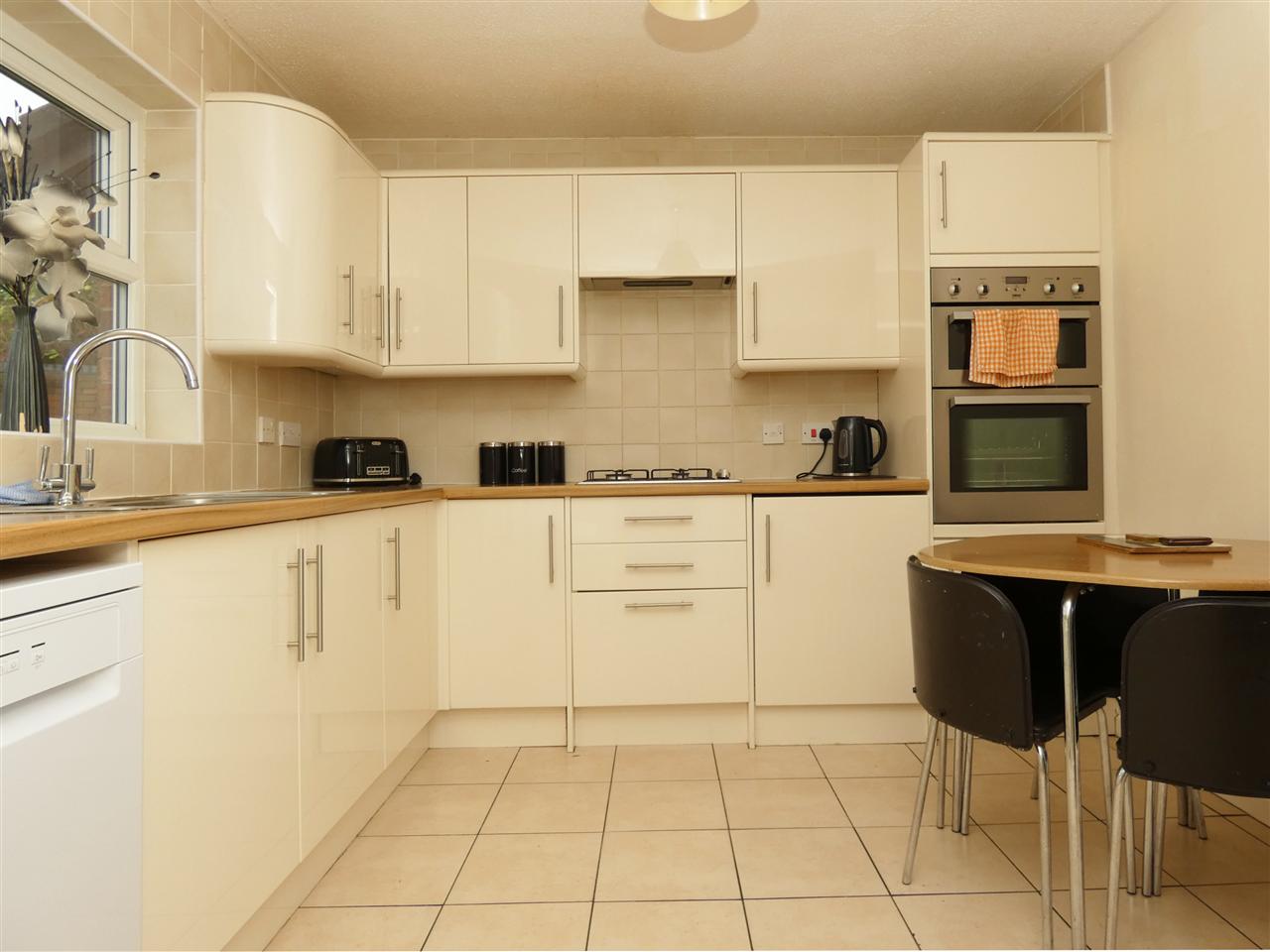 equipped with a matching range of base and wall units, working surfaces, single drainer stainless steel sink, built in double oven, gas hob with extractor fan over, integrated fridge, plumbing for dishwasher, tiled splashbacks, tiled floor, window to the rear elevation.