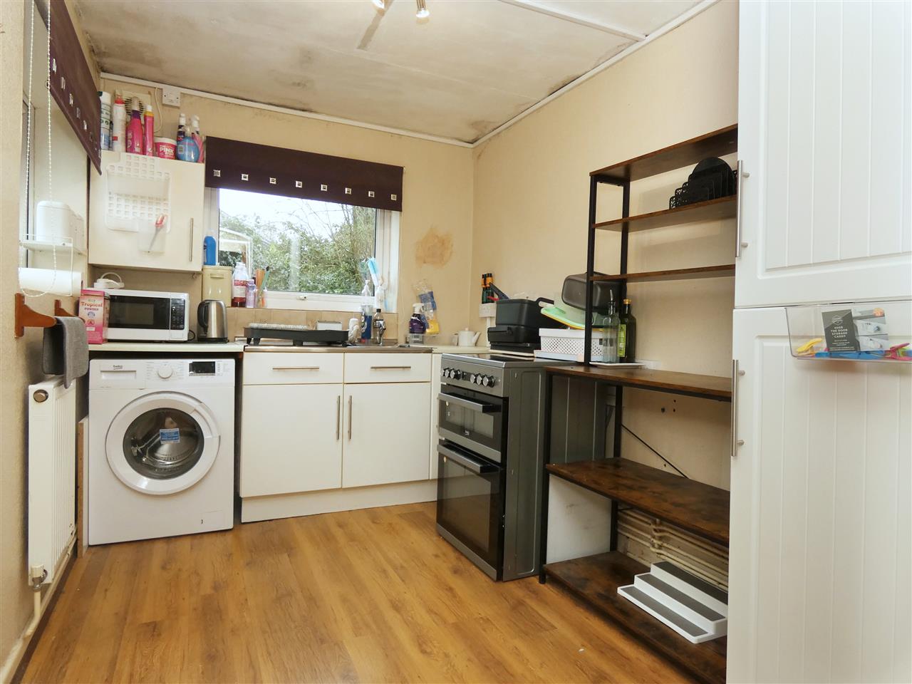 with base unit, single drainer stainless steel sink, plumbing for washing machine, electric cooker point, windows to the side and rear elevations and door to garden.