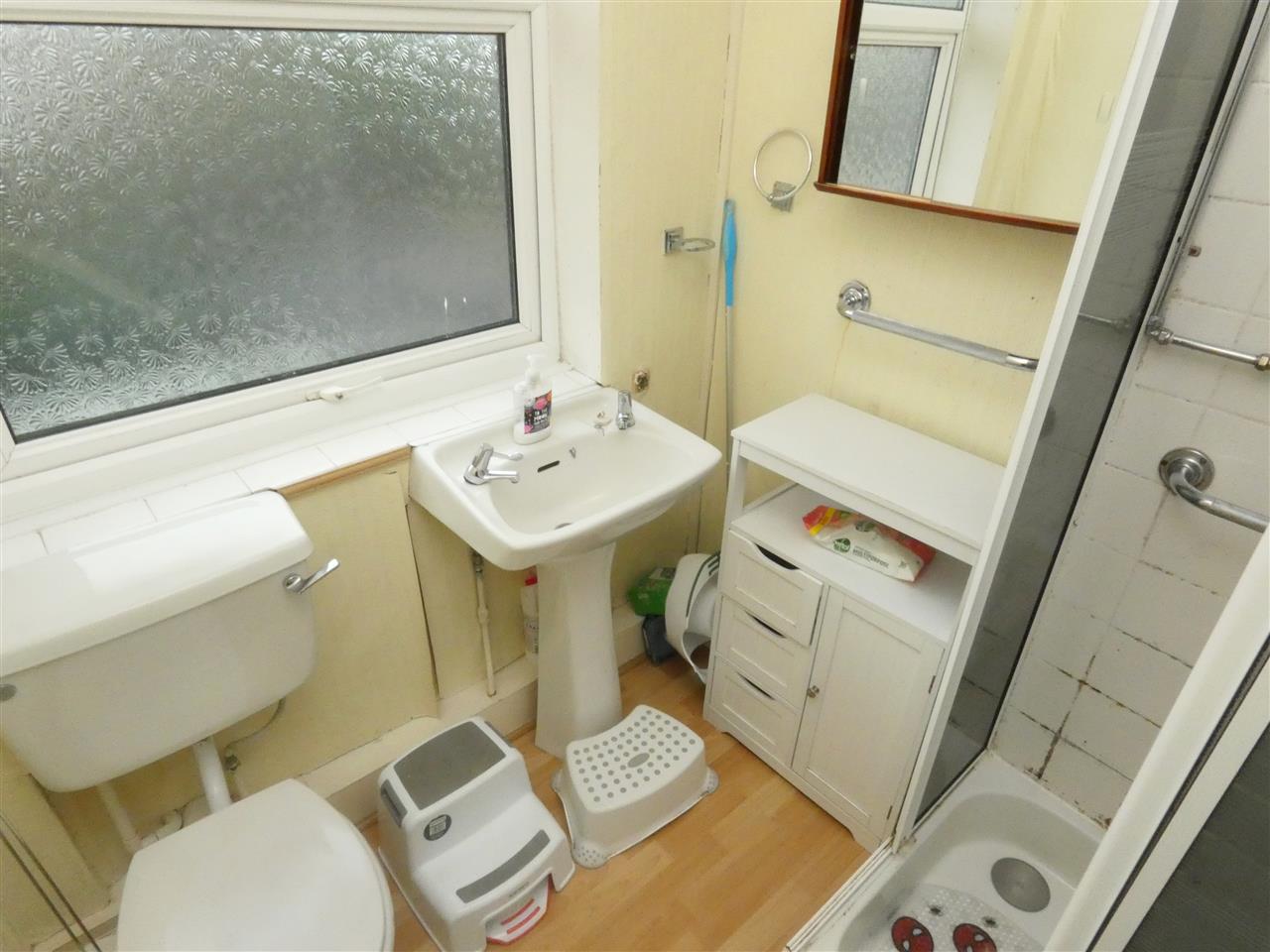 comprising of a shower cubicle with Triton fitment, pedestal wash hand basin, low level WC, laminate flooring, window to the rear elevation.
