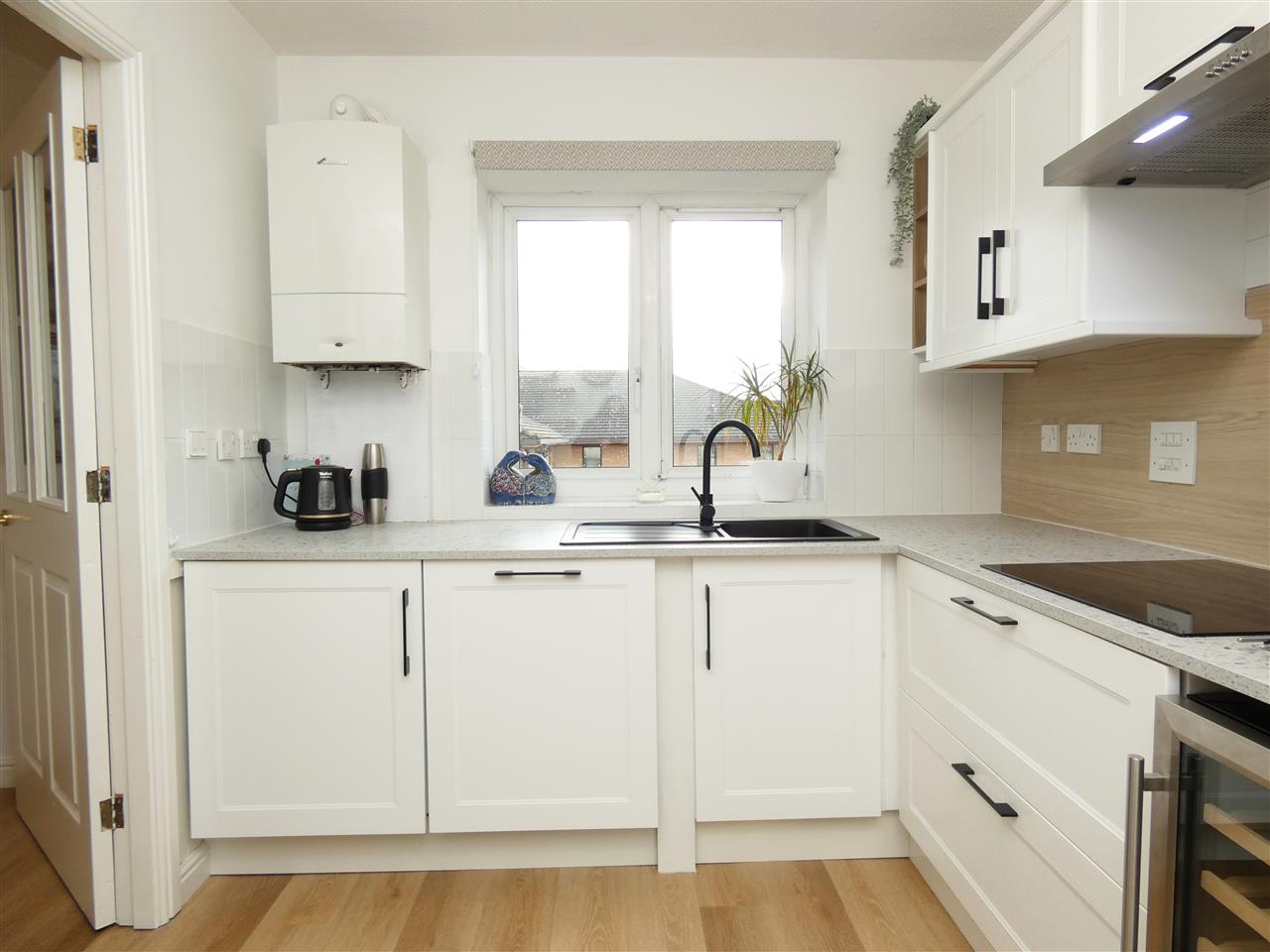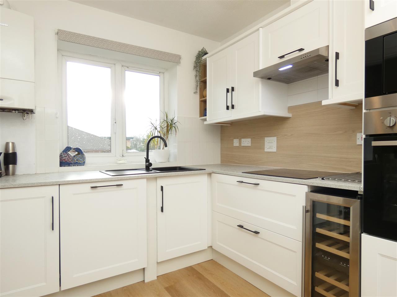 equipped with a modern range of base and wall units, working surfaces, single drainer moulded sink unit, built in hob with extractor hood over, built in oven, integrated microwave, washer/dryer, dishwasher and fridge freezer, wine cooler, LVT flooring, window to the front elevation.