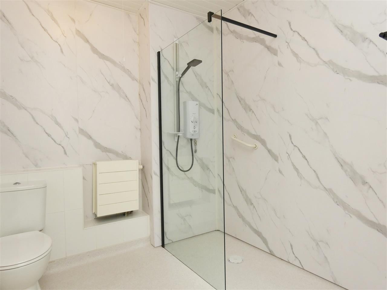 comprising of a walk in shower with glazed screen and Mira fitment, vanity wash hand basin, low level WC, tiled walls.