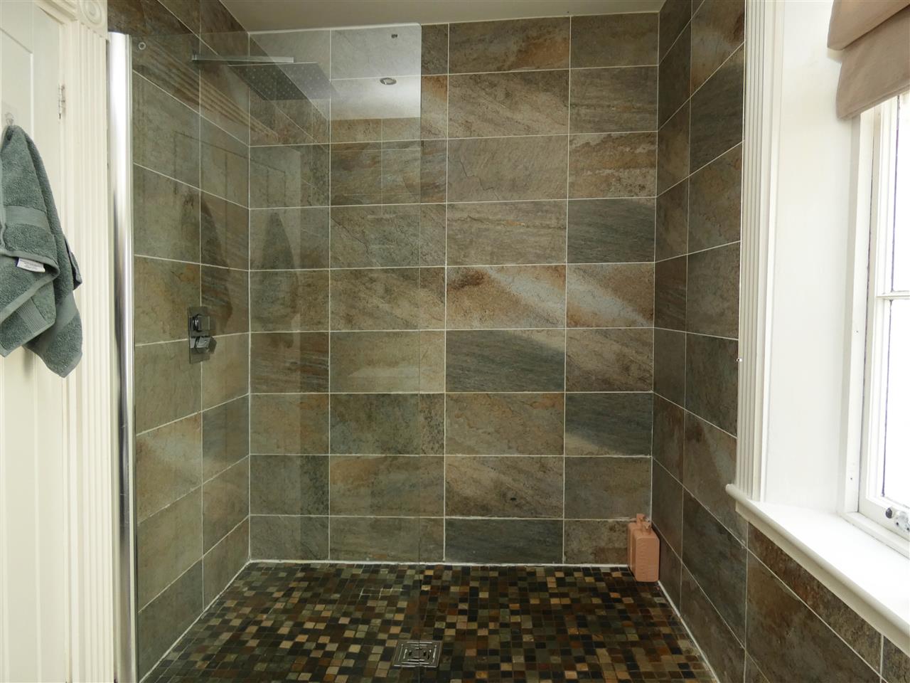 comprising of a modern three piece suite including shower enclosure with glazed screen, rainwater fitment and recessed wall mounted controls, wall hung wash hand basin with waterfall tap, low level WC, heated chrome towel rail, tiled walls and floor, spot lighting, window to the side elevation.