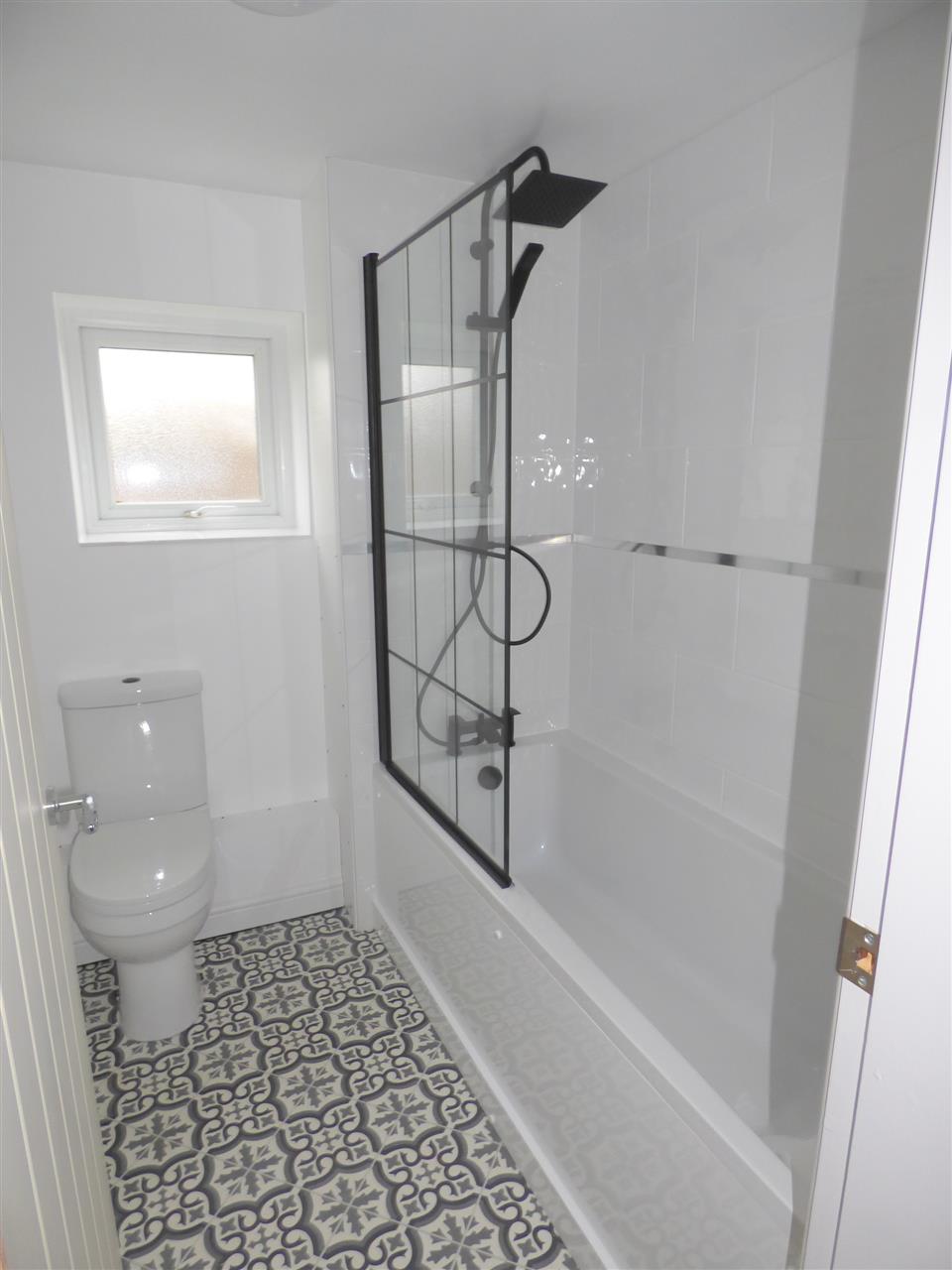 equipped with a modern three piece suite including panelled bath with mixer taps and shower attachment over, glazed shower screen, built in WC, vanity wash hand basin, part tiled walls, window to the side elevation.