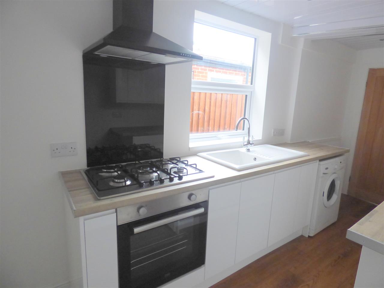 Fitted with a range of high gloss wall and base units, working surfaces, gas hob and electric oven, plumbing for washing machine, laminate flooring and window to the side elevation.