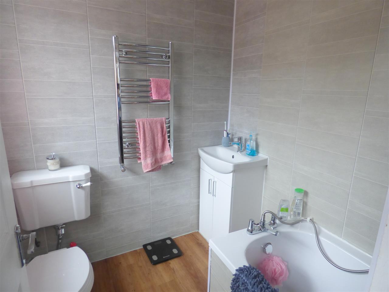 Fitted with a white three piece suite, heated towel rail, over the bath shower, laminate flooring and window to the side aspect.