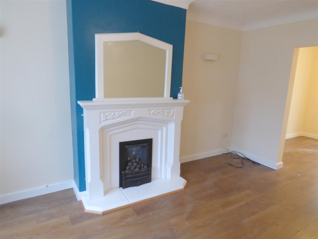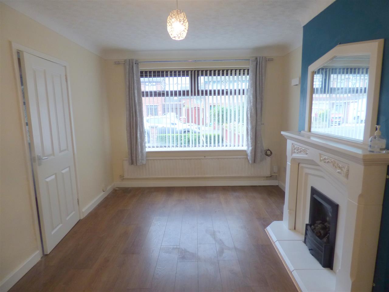 Laminate flooring with feature fireplace and window to the front aspect.