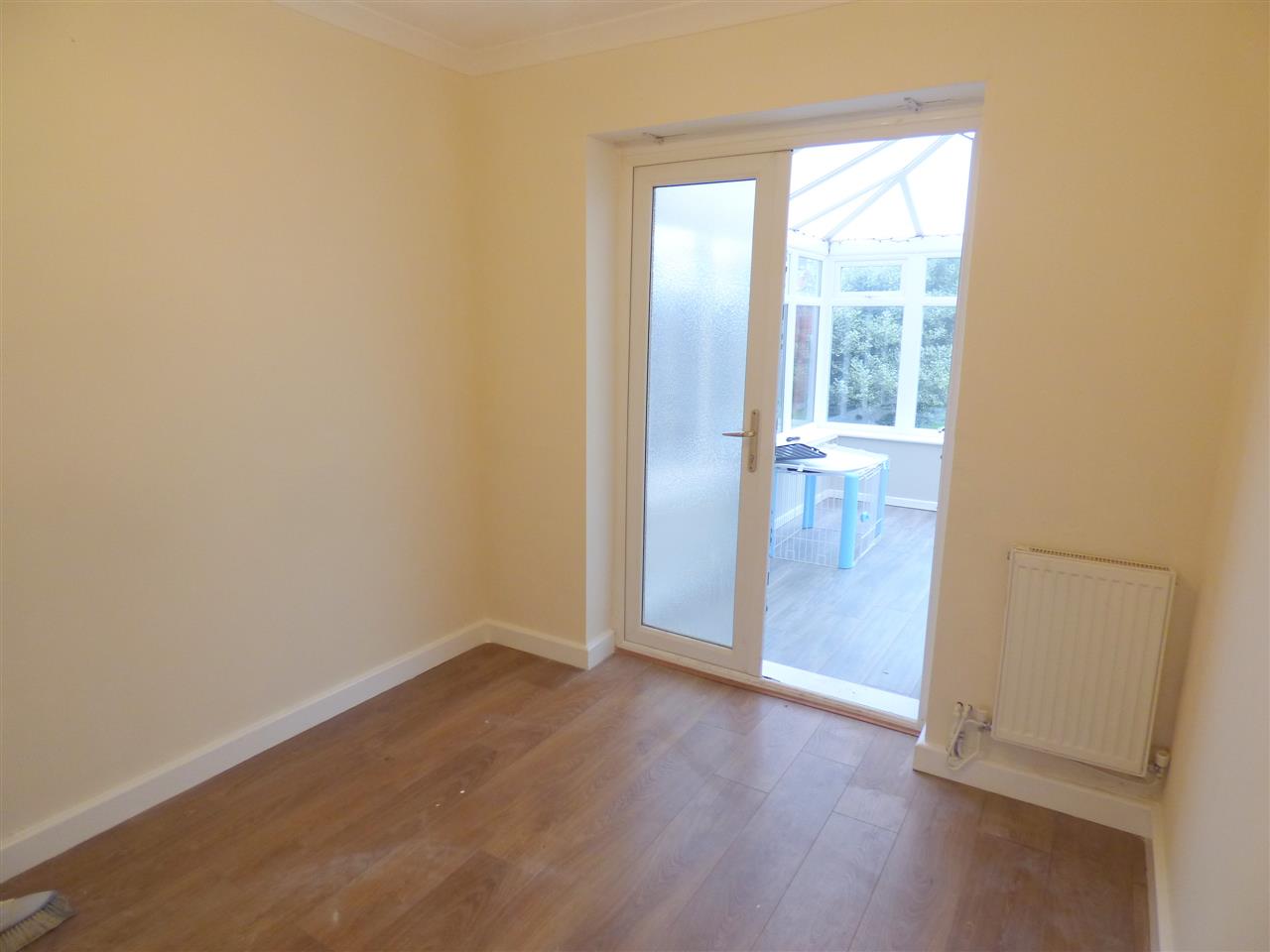 Laminate flooring with double doors leading to the conservatory.