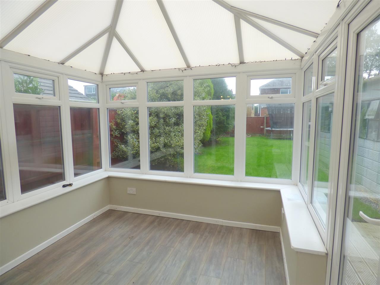 Laminate flooring with patio doors leading to the garden.