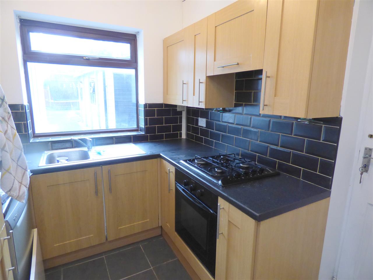 Fitted with a range of wall and base units complimentary working surfaces, integrated oven and hob, door leading to rear garden. Window to the rear aspect.