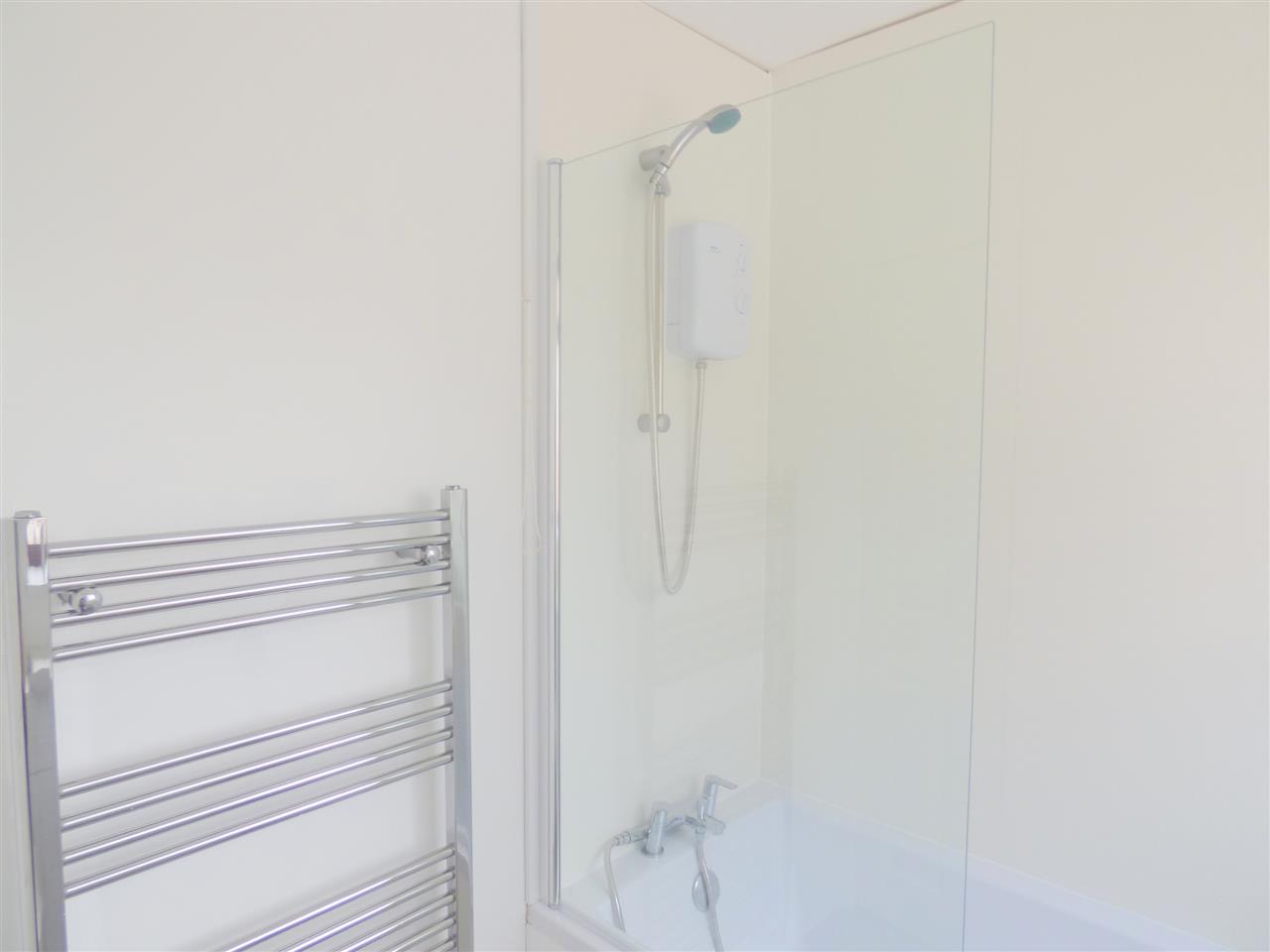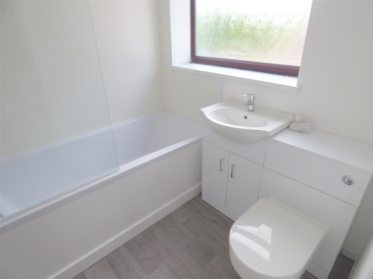 Vynil flooring with white three piece bathroom suite, electric shower and window to the side aspect.